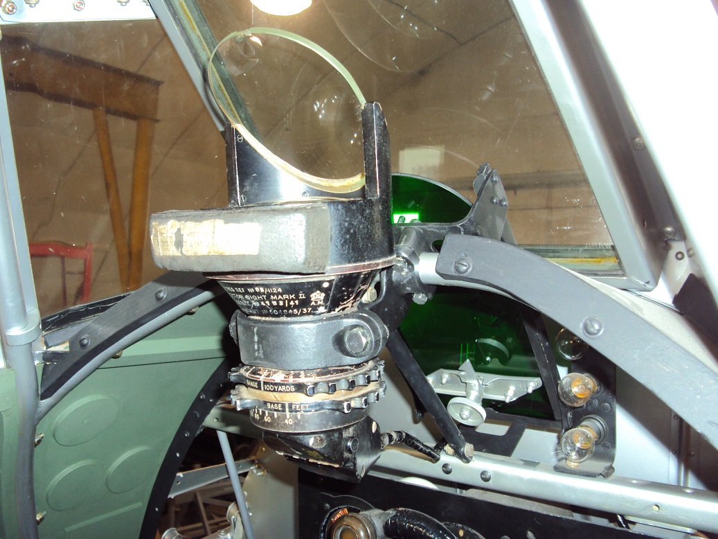 Gun sight shade bracket repaired (upper). With newly manufactured green panel mounted between the windscreen and the newly installed gun sight. Our thanks go out to Ron Taylor for giving us the heads up on what we were looking at with the shade lock mechanism.