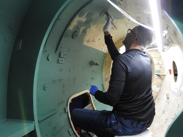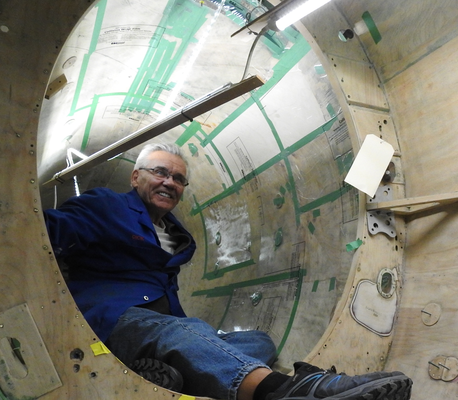 From the right side interior, the team is now focused on closing up the inside as they double check the skins for defects that require just minor repairs, new glue and painting. Interior painting is moving aft to meet up with the guys moving forward from the tail. Work is slowed down a little as the space in the rear fuselage is very limited and the confined space presents both comfort and stamina issues as well.
