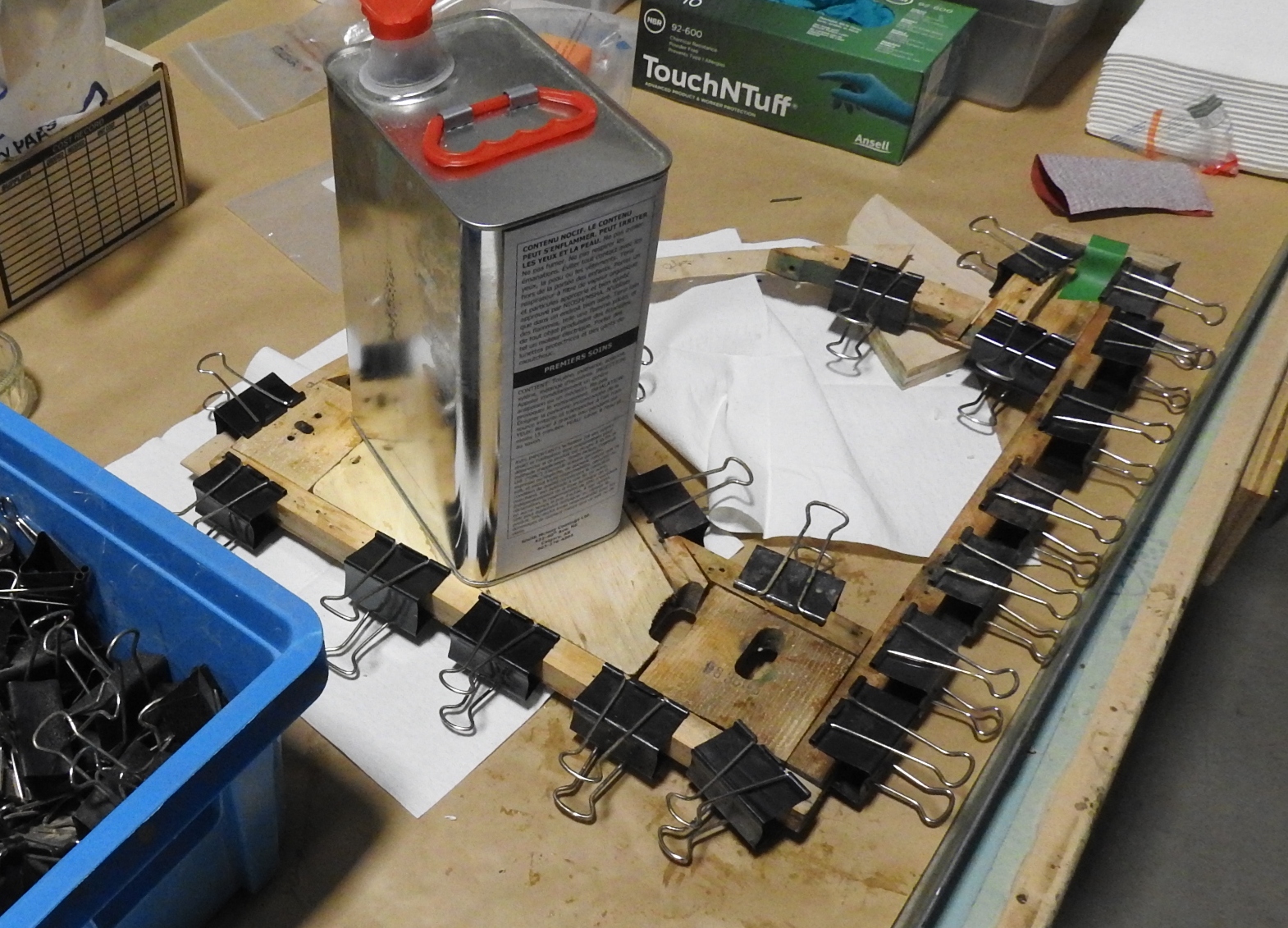 "Think you used enough clamps there, Butch?" The wooden frame for Bulkhead 2.5 being reassembled and glued by Roger D. and Peter V. Most of the original wood was good enough to be reused.