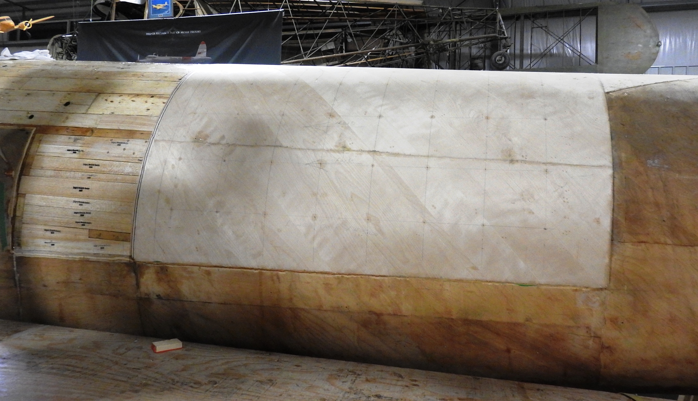 This largest patch to date required bleed holes for excess glue, alignment pins, and dry fits to check the scarfs with hand sanded joints to get the skin down as accurately as possible. Then Bomber Command Museum curator Karl K. and his crew helped by getting the hangar ready for the long day ahead for the gluing and vacuum process.