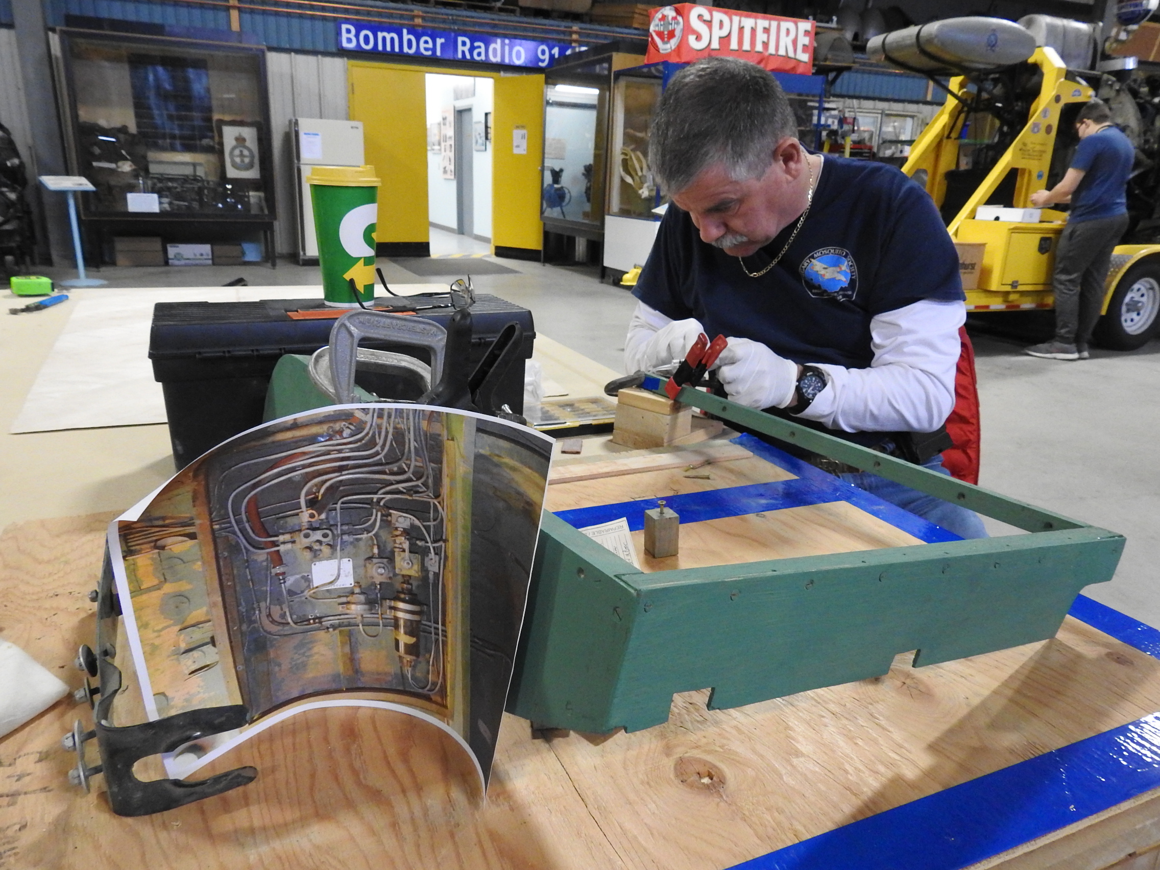 Michael H., with pre-disassembly reference photo at hand, works on the wood frame for the hydraulic panel which is to be reinstalled on the right rear inside fuselage.