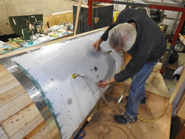 Dick examines the largest skin repair patch to date. To get sufficient vacuum we use three pumps and two lines to 'suck' it down. It is positioned by wood pins and the patch has numerous holes to allow excess glue to escape.