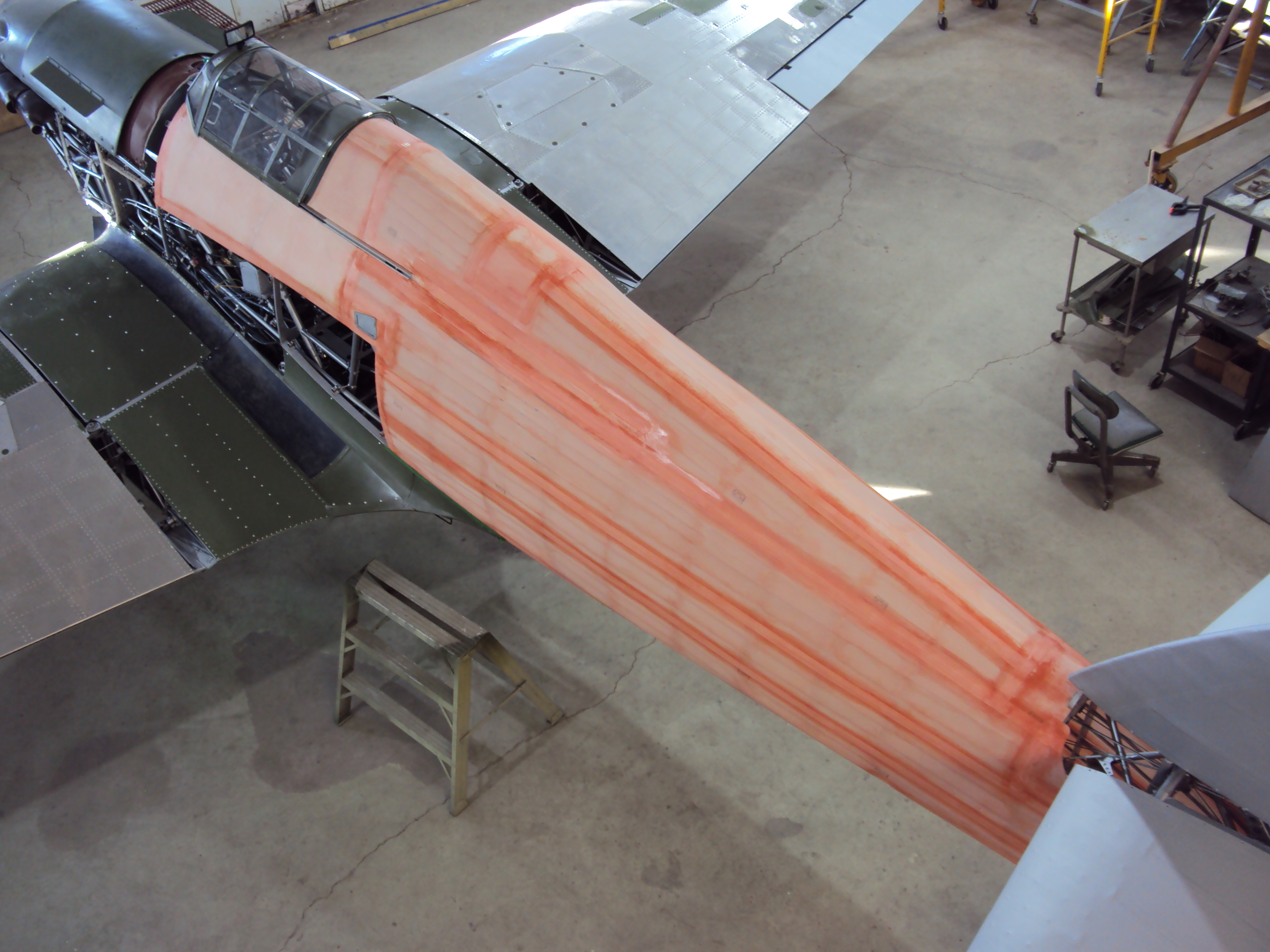 Green is good and there was none of it inside the rear fuselage a year ago. New green paint means that all structural repairs have been completed in an area and we can begin to install parts and systems. Not ready yet, last year at this time.