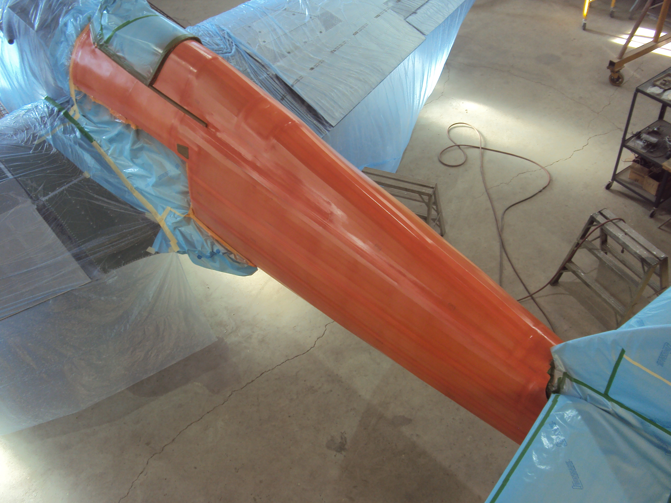 Many steps later after the fabric has been fitted, attached, shrunk, taped and had its first coat of Poly Brush applied.