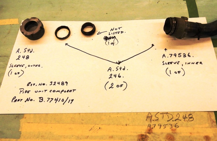 Last month we received a package, courtesy again of our friend David Coeshall in England, with a variety of Mosquito parts. Three years ago we purchased a parts collection from Tony Bianchi when he was cleaning out his hangar. After David acquired and shipped the initial collection Tony discovered a few more odds and ends which David has been holding for us. Of particular interest was an exhaust pipe, of which we have none. One down, 23 to go...