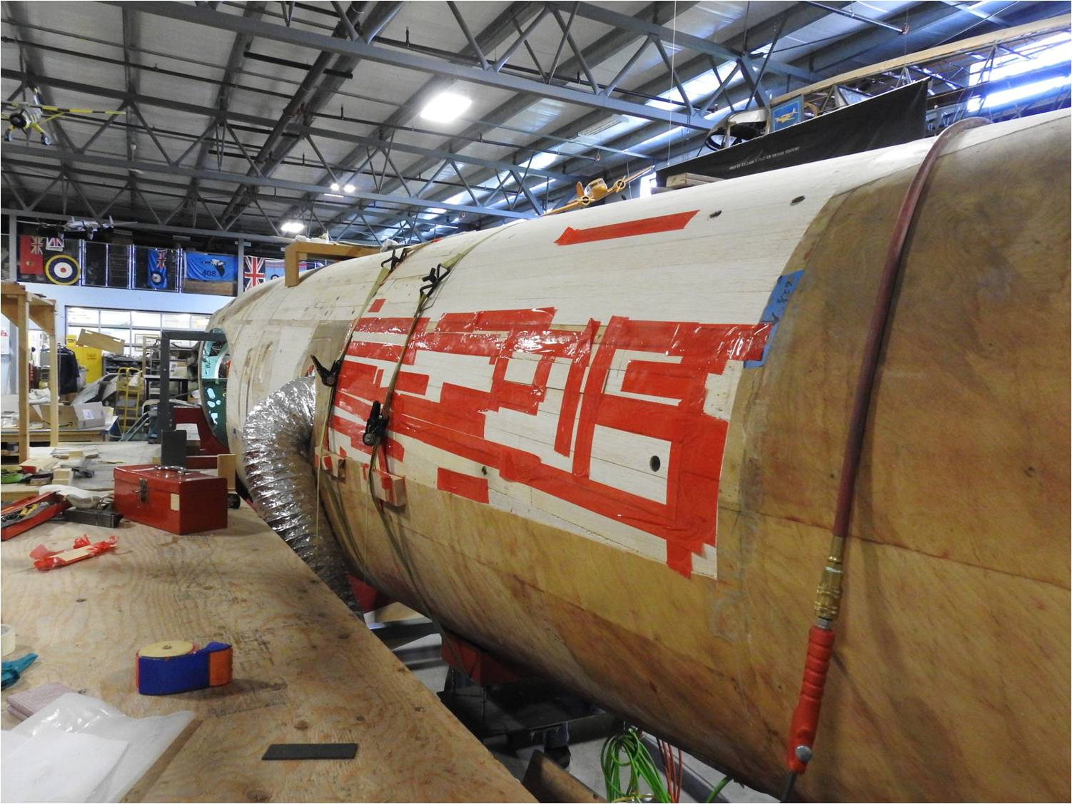 Beginning the many step process of applying fabric to the fuselage.