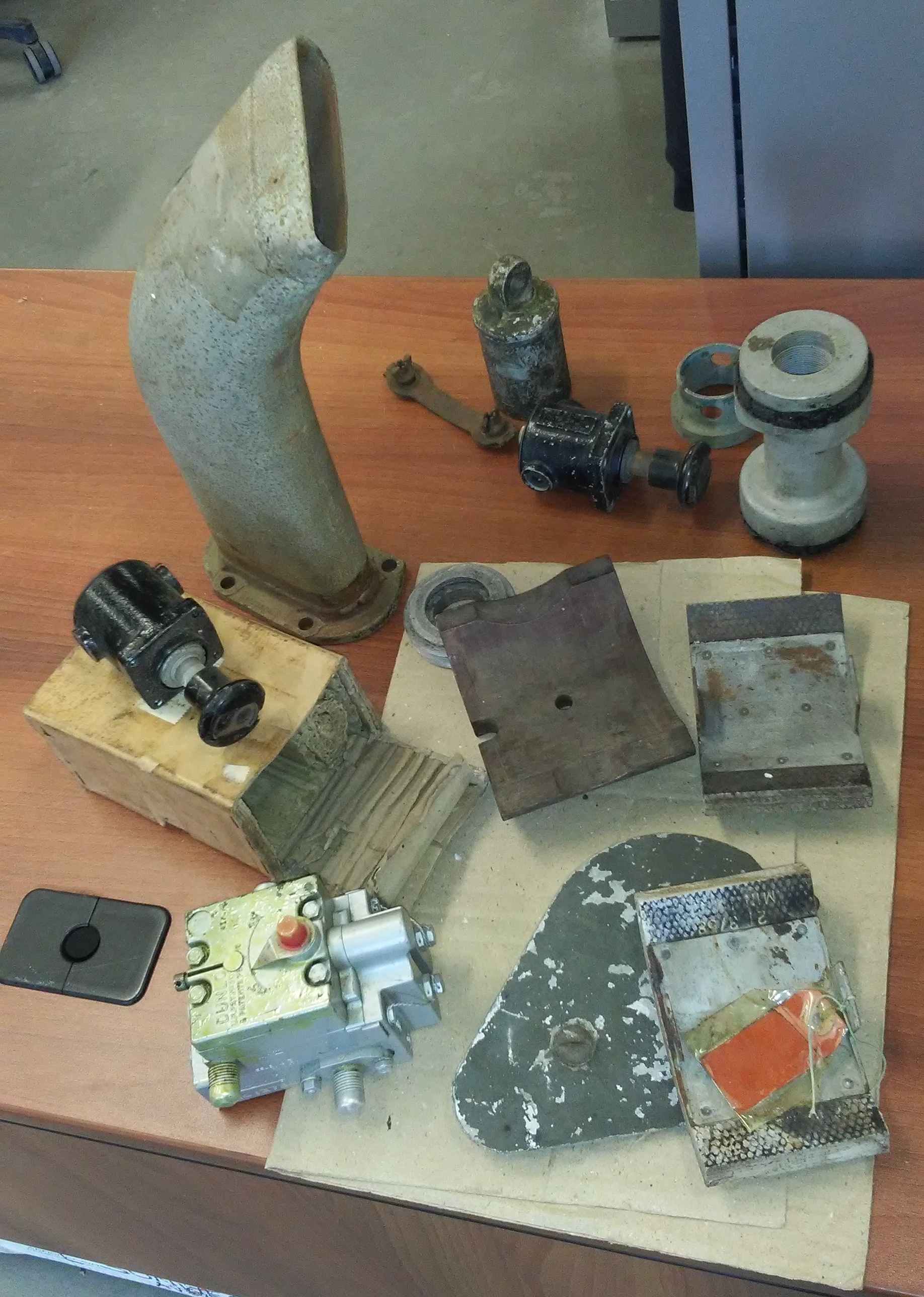 Our latest little treasure trove, courtesy of David Coeshall in England. The new hydraulic unit is at the lower left. Not very exciting to anyone but a Mossie nerd, but much needed. Additionally there are prop feathering buttons, a hydraulic piston, brake shoes, an access plate and our first exhaust stub.