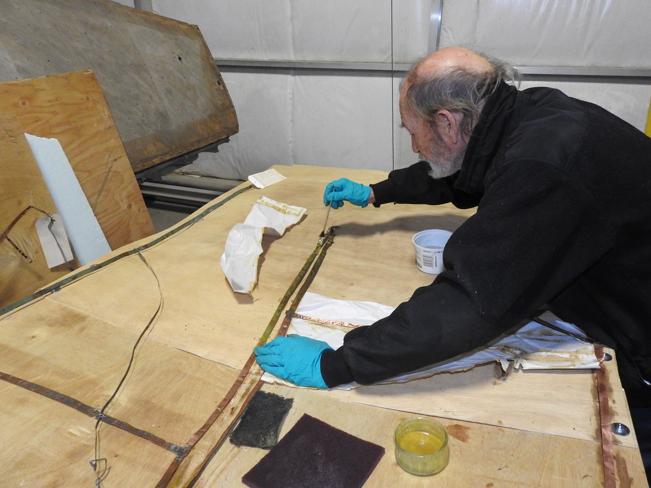 Jeannot working on the copper grounding straps that criss cross the interior of the fuselage. After they were carefully removed they were mounted on boards so they could be paint stripped and polished. Our thanks to Jeannot for tackling this pain staking and often smelly job.