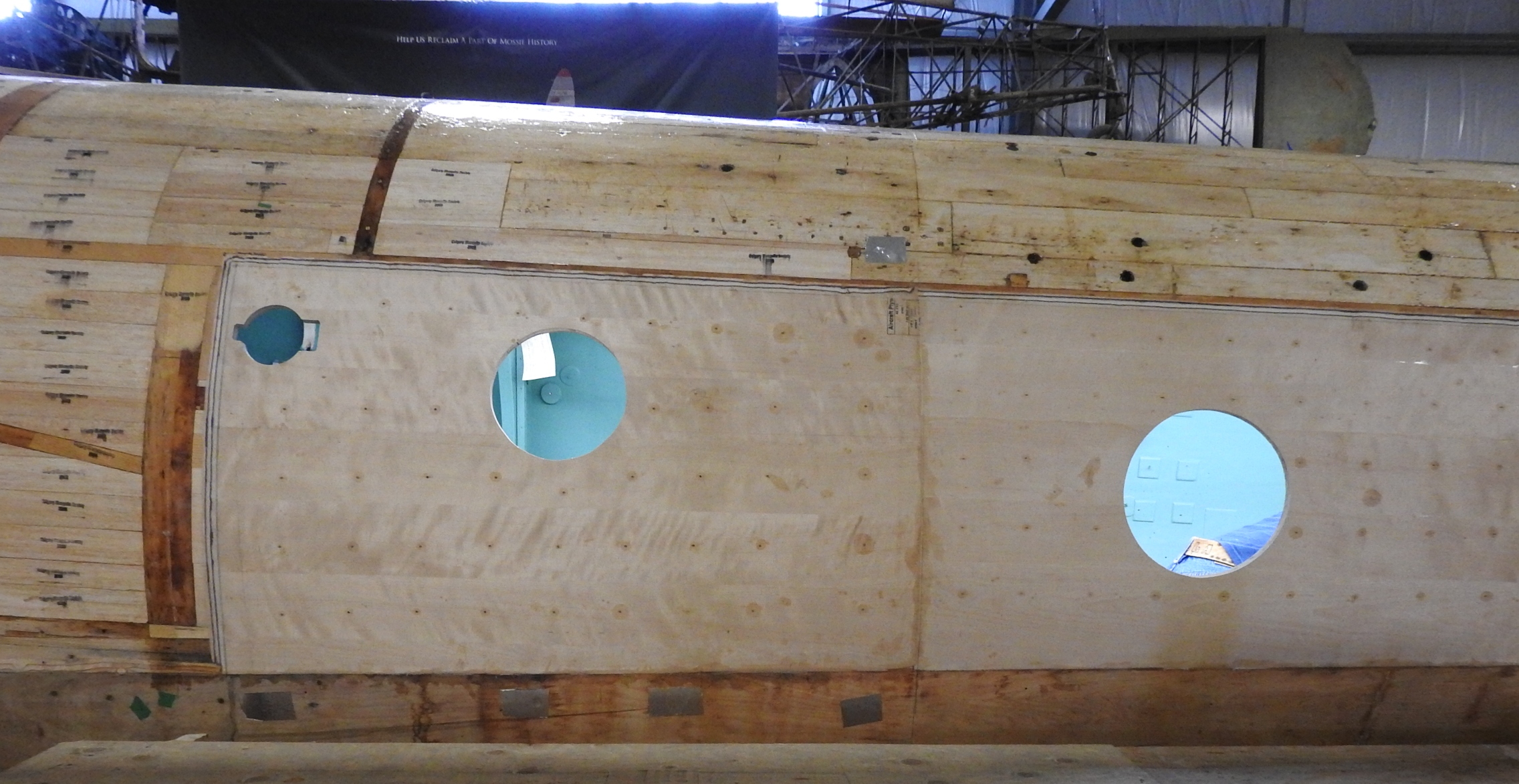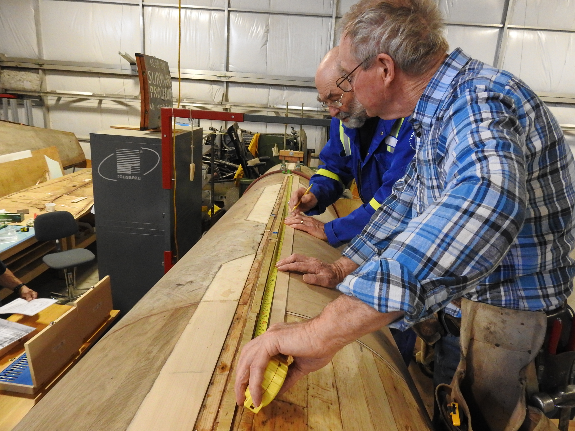Roger and Peter have worked on the upper, exterior center line of the fuselage repairing plywood damage with layers of veneer then constructing a new strip of skin. We will be working on some final fit and finish issues before gluing the material on.