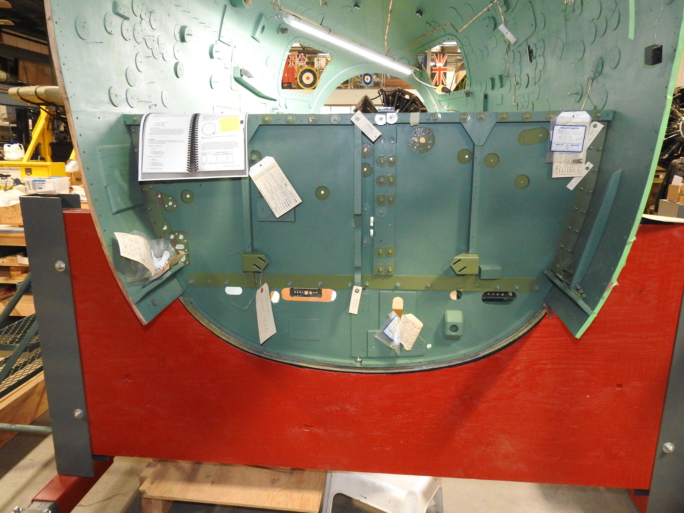 The rear side of bulkhead 2 where Andy W. is focused on reinstalling all of the hardware. On the front side of this bulkhead is the armour plate which protected the crew's lower legs, but also provided significant rigidity and strength to the forward fuselage area.