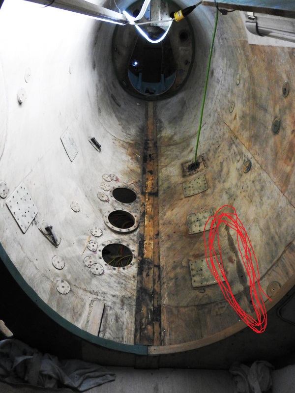 Inside the lower fuselage between bulkheads 5 and 6. The centerline strip has been removed and as can be seen, a lot of wood is stained and impregnated requiring us to clean as best as possible and then seal before painting. The area in red, as described below, presents a bit of a mystery as drawings and photos show this to be the attach point for a small platform. It was absent from our airplane and we are trying to figure if it was removed by Spartan or whether it was taken out and lost during earlier restoration efforts.