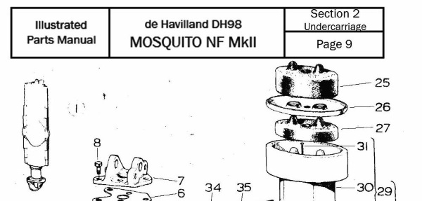 I believe the part has never been installed and is therefore NOS but shows some age of course. I'm not even sure it's from a Mosquito, but Dad thought it was correct, although not verified. Part # is G.9810 [Ed. It is of course a main undercarriage leg rubber compression block. Item 25 in the illustration below]. I thought that you might need the Mosquito bumper for your restoration, so I've attached a few pics for you to look at to verify the part for size, authenticity, etc. Just let me know what you think.