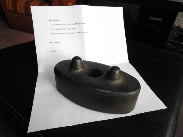 Thank you Jim. Item received and we will ensure its place in the restoration of our Mosquito in memory of your father Don Girvan.