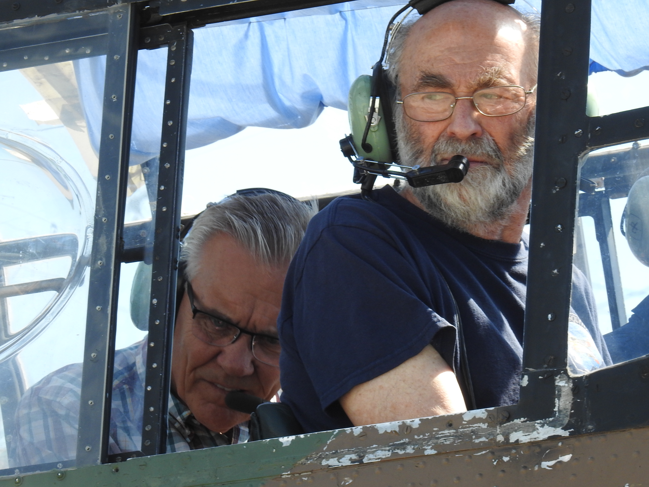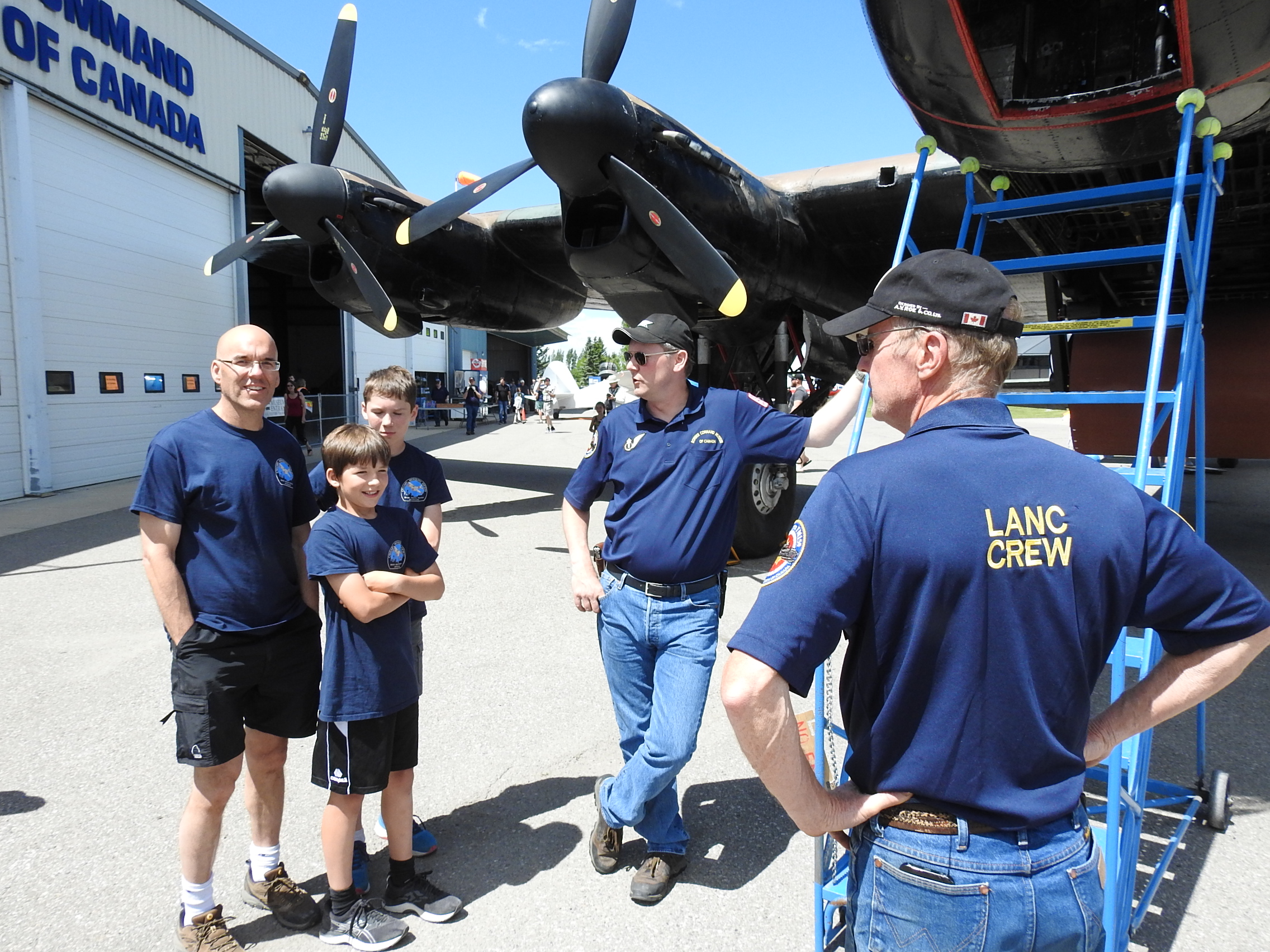 CMS volunteers Dick S. and Peter V. enjoy the morning Lancaster engine run from inside the airplane while below, Steve S. with sons Matthew and Andrew await their turn for the afternoon run. Big thanks to the Bomber Command Museum and to the Lanc crew for the privilege.