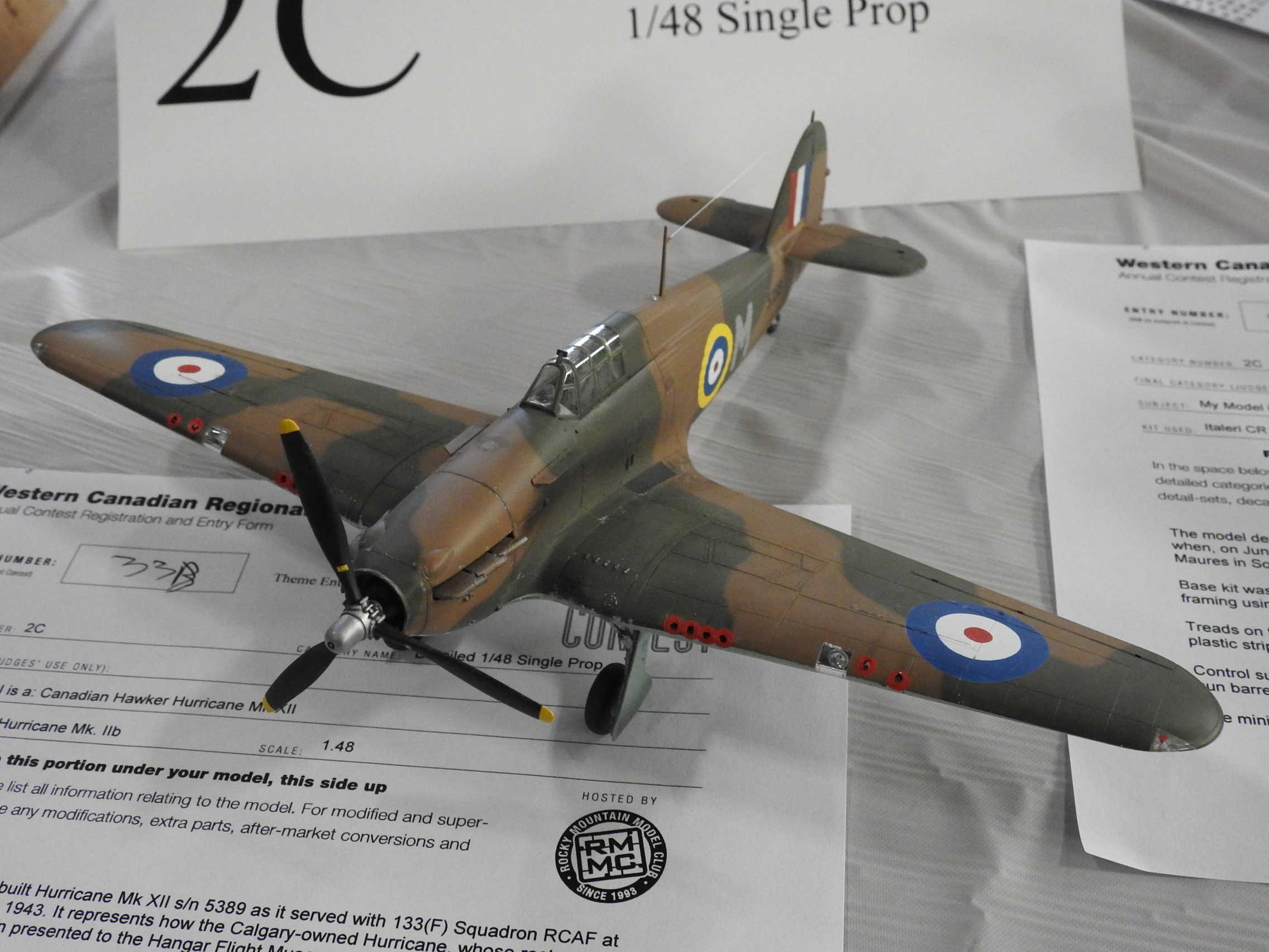 Above, one of the entries for the Western Canada Regional Model Contest, Silver Anniversary event was this beautiful 1/48th scale replica of our Hurricane by CMS board member Andy W. Below, organizer Rick F. addresses party goers at the Spitfire Swing fundraising event that same evening.
