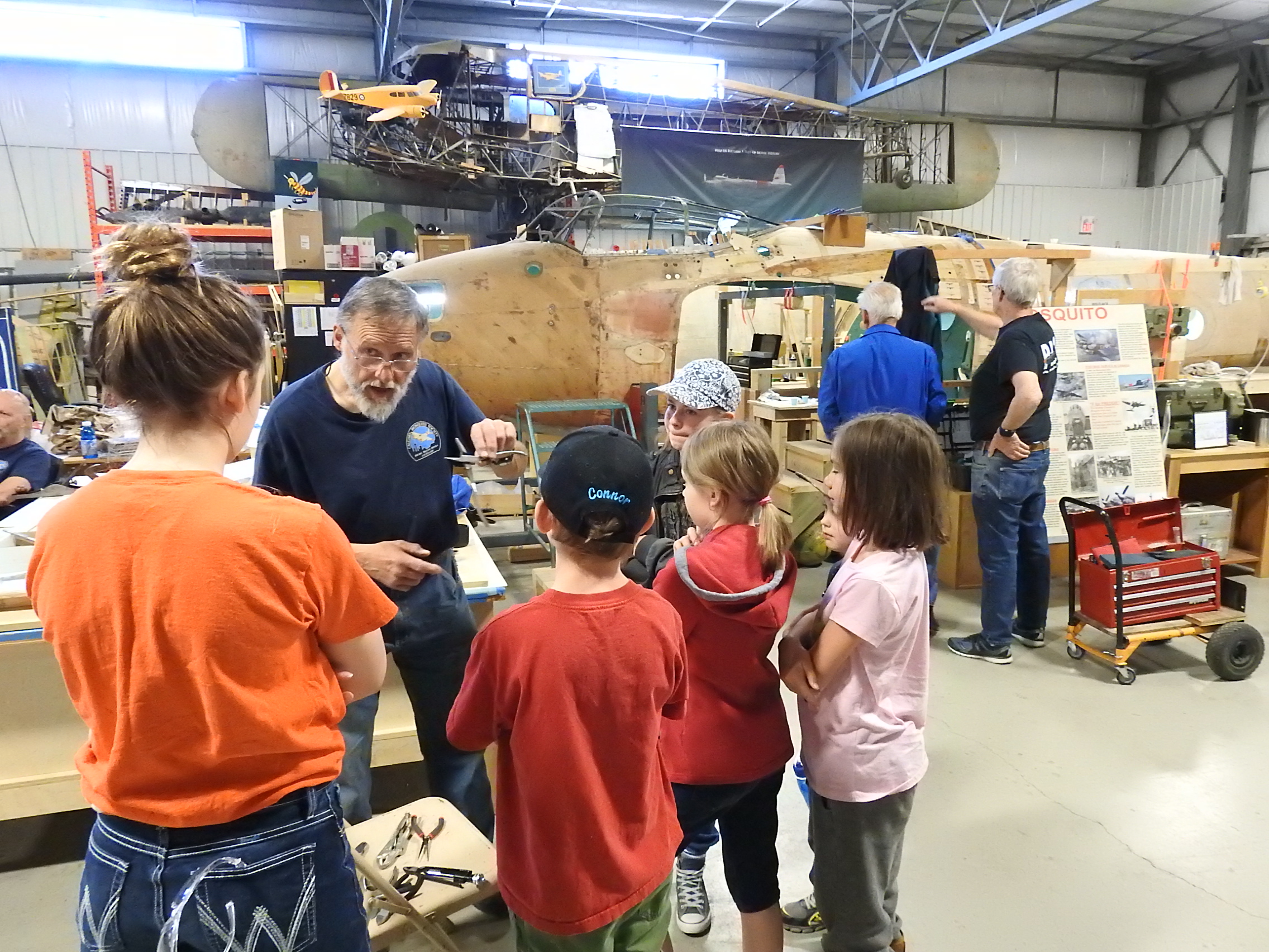 One of our key volunteers, Davey D. spends some time with High River 4H kids demonstrating some of the skills required to restore the Mosquito.