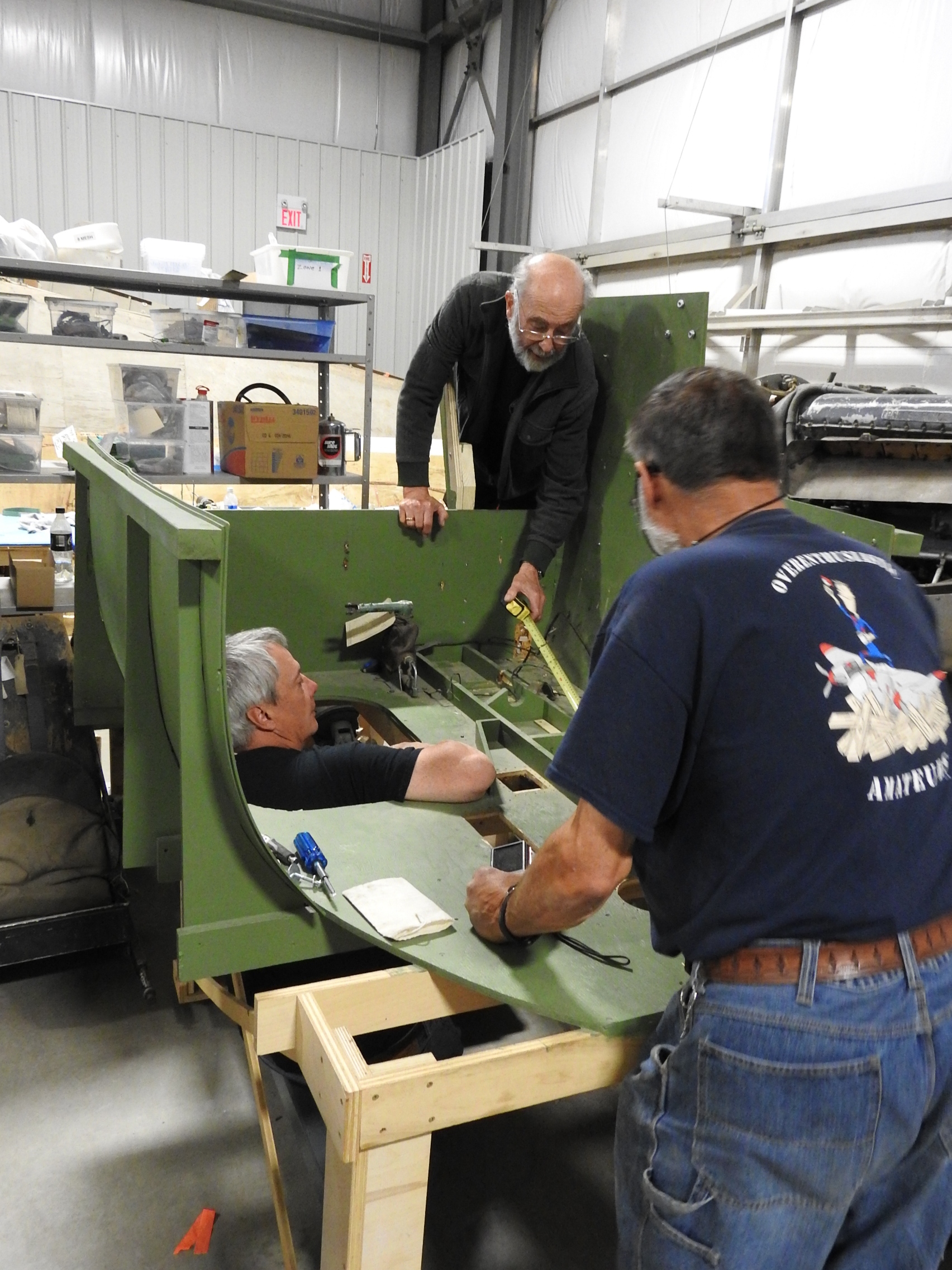 Don, Peter and Davey remove the pilot seat, controls and fixtures from our cockpit mock up in order to begin restoring the parts and installing them in the actual cockpit.