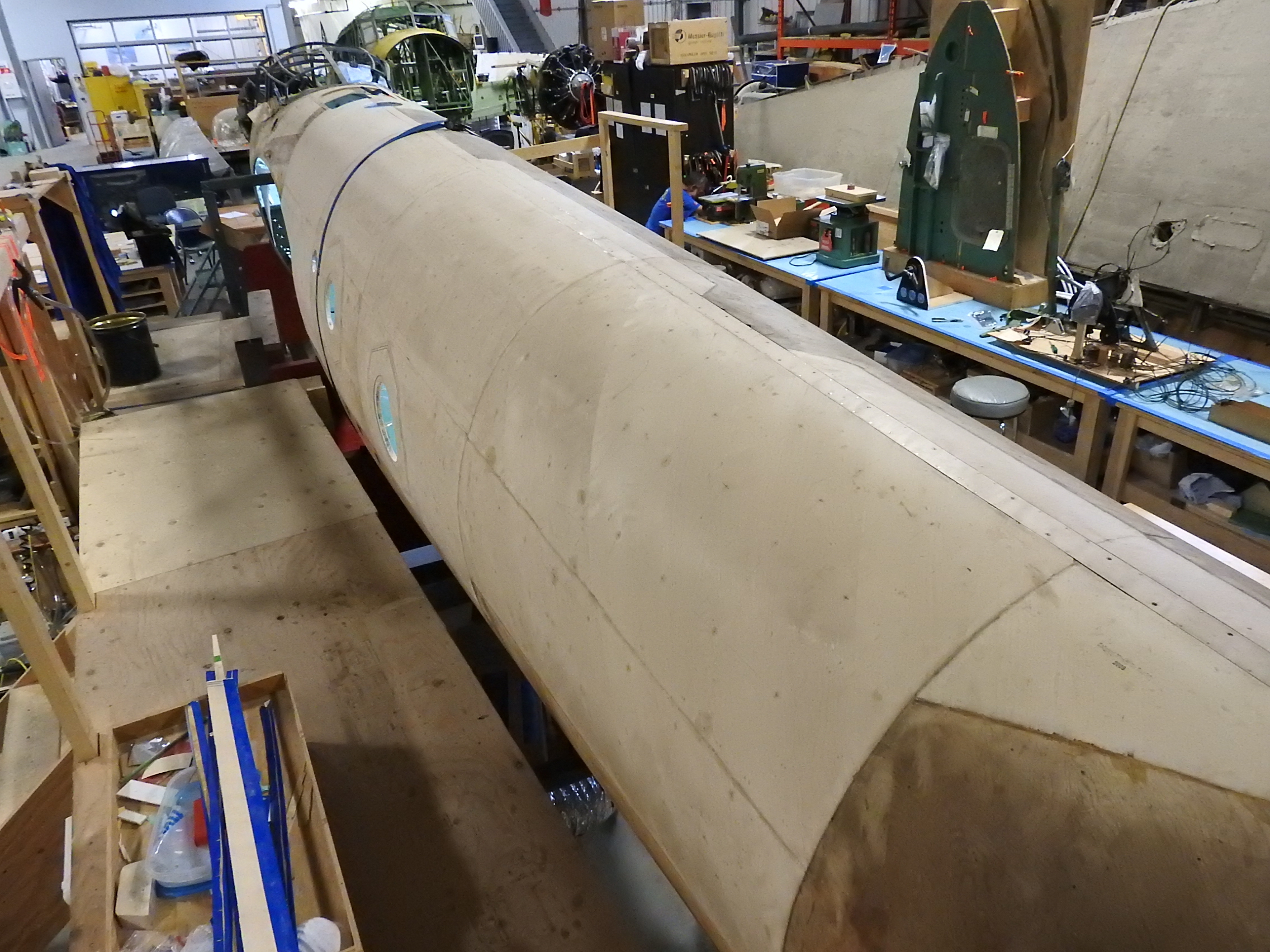 Looking forward along the port side of the fuselage you can see that it is almost all covered in new plywood skins. With the exception of the most recent forward section, it is all 2 mm thick, 3 ply birch made to the same specifications as used by DH during the war.