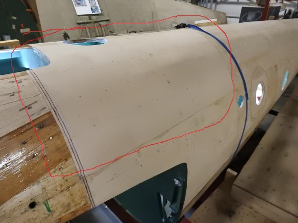 The first 3 mm skin section now successfully installed after weeks of wrestling with new challenges presented by the thicker ply, including scarfing to the 2 mm skins.