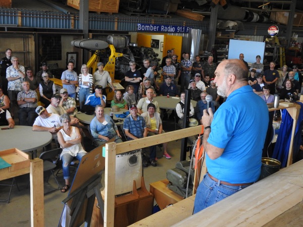 On completion of the run, we encouraged visitors to head straight to the Mosquito where restoration boss, Jack McWilliam did a great 'walk and talk' on the joys and challenges of restoring the airplane. This year Jack's talk saw double the attendance of last year's event. While there, we drew the visitors attention to some of the artifact displays set up for the day including a refreshed 'Aerial Photo Mapping' exhibit by board member Don H, souvenir sales including authentic Mosquito skin key chains, courtesy of efforts of Jack and Colette, a used books sales table and much more.