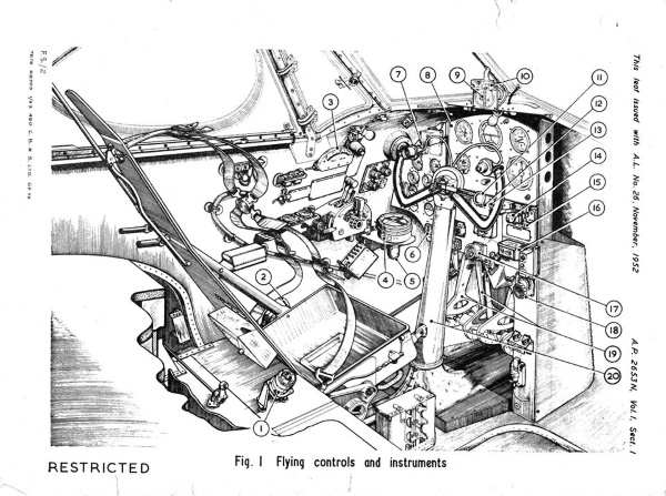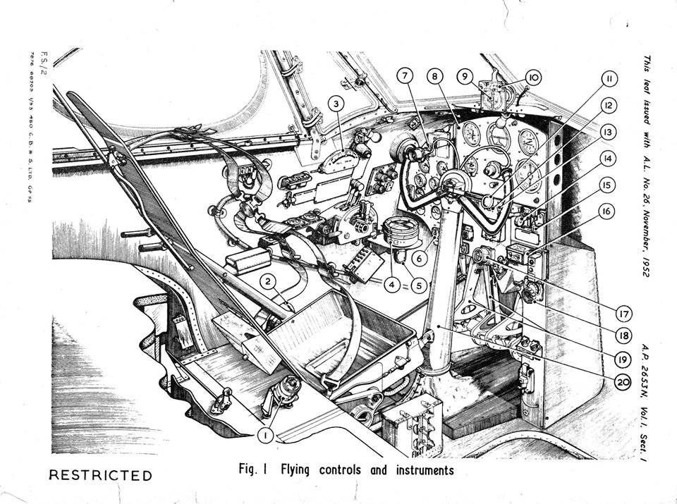 In this diagram for the PR.35 cockpit you can just see the trim mechanism to the left of the pilot’s seat, indicated as item #2. The trim indicator is mounted just above the throttle, also to the pilot’s left and is identified as item #3.