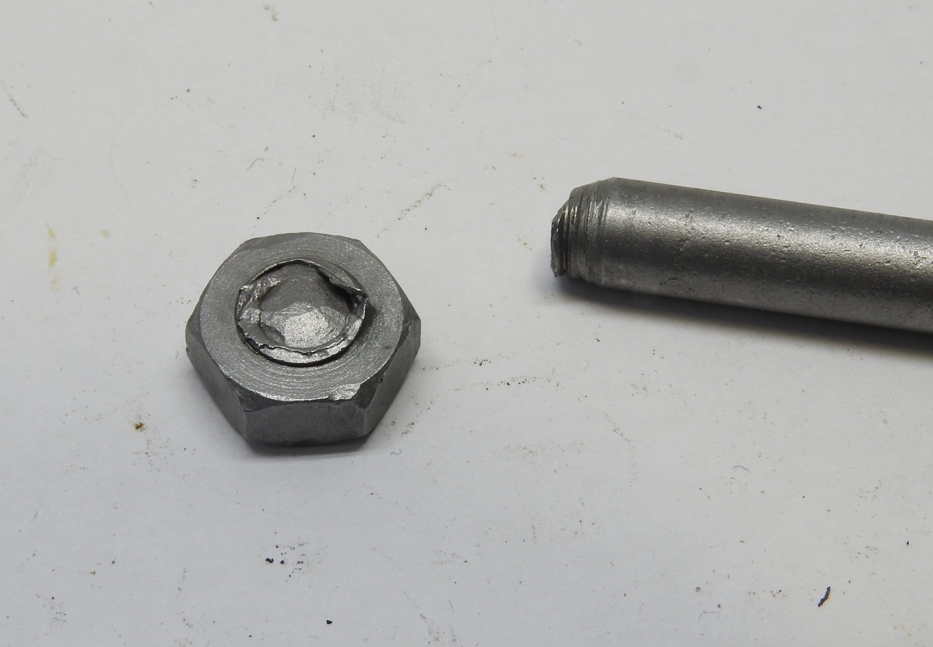 In addition to hammering over the end of the bolts, another favourite technique to secure a nut was to hammer a sharp pointy thing into the bolt threads as pictured above. Was it effective? Ask Davey, D. who tried to spin a nut off just such a bolt. The result, above.