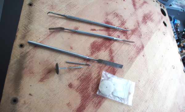 Some of the tools of the trade; fine picks and scrapers and a few Dremel rotary tools. Removing the fittings, peeling the fabric and scraping the layers of paint and dope from just one panel is a +50 hour process.