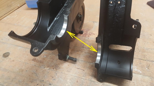 The arrows point to the surfaces through which the elevator crank runs. Though it's not a bearing surface, it's a snug fit and the thick powder coating has made it too tight.