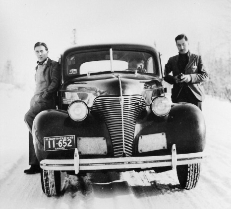 Training days: Maurice Briggs, Alf Smitz (at the wheel) and their colleague Brighouse, on leave from #37 SFTS in January 1943, en route from Calgary to Banff, Alberta, where Smitz met his future wife. That spring, the men returned to England and the war. [A.J. Smith]