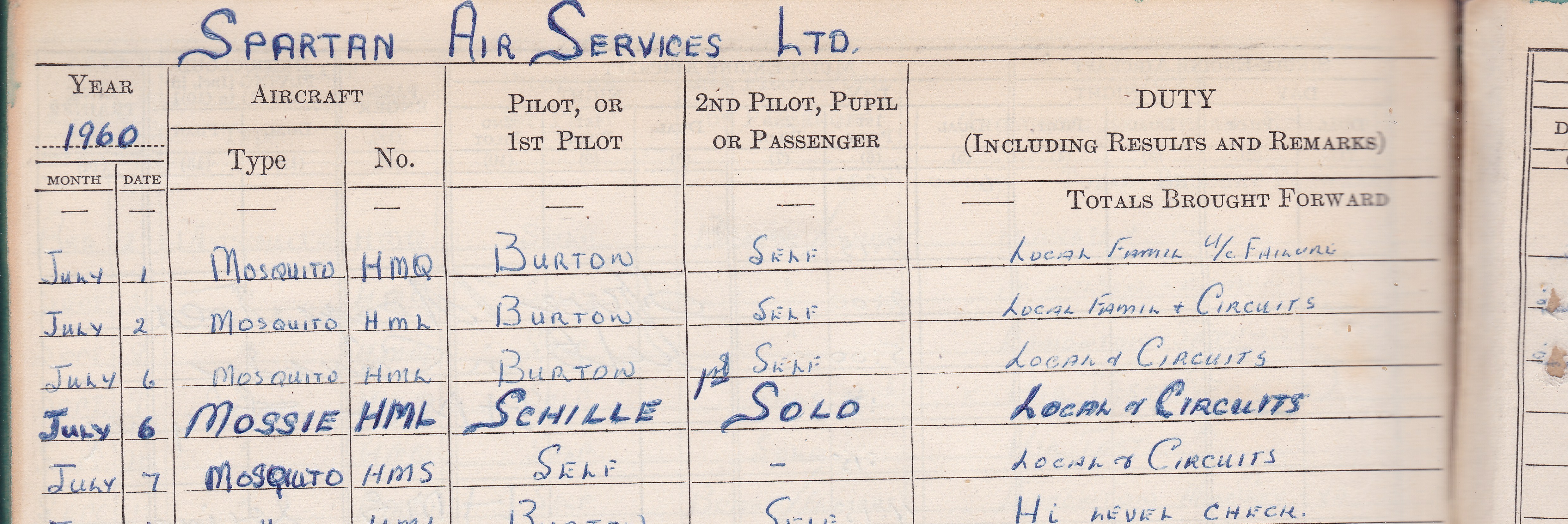 The fifth line down, dated July 7, details the second last flight of our Mosquito made by Vern Schille.