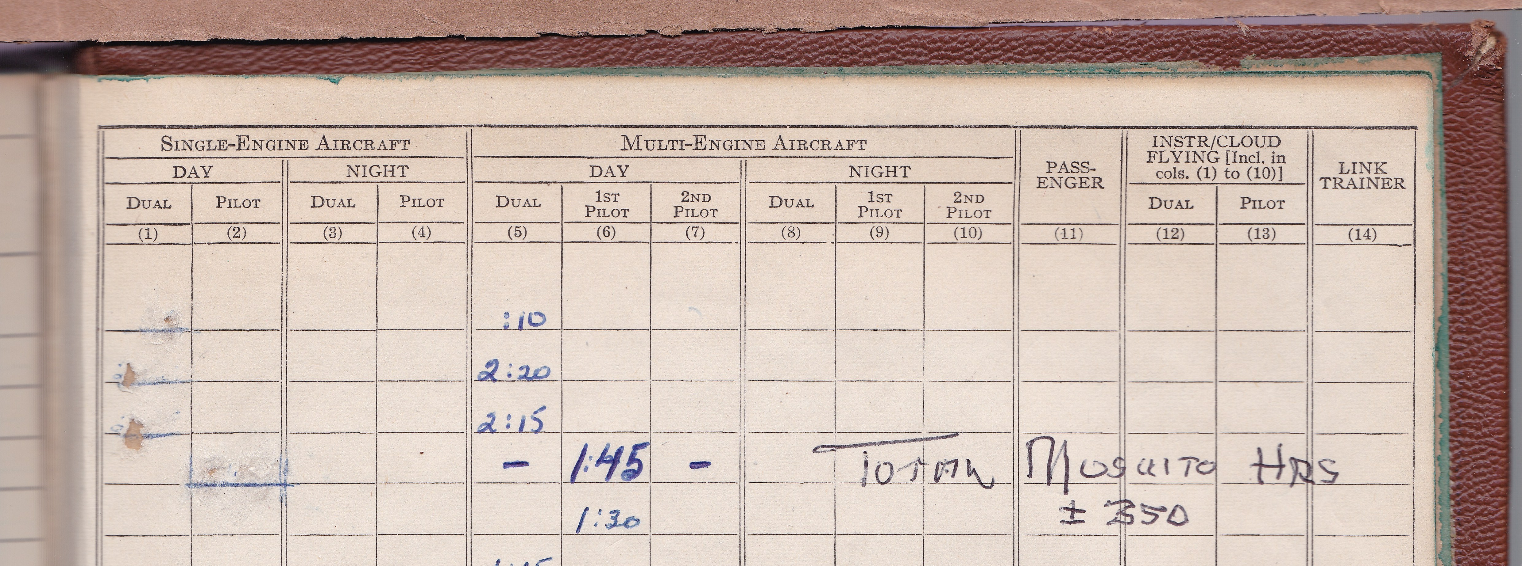Back in 2014 when we were producing our video series, we made contact with Spartan Mosquito pilot Vern Schille, whom we featured in a couple of our short films. In them, Vern makes very clear his love for the Mosquito and that it was his favourite of all the aircraft types he flew in his over 40,000 hour career as a pilot in the RCAF and afterward. When I spoke at the Canadian Warplane Heritage in Hamilton last October, I was thrilled that Vern made the trip to sit in while I told the story of 'Calgary's Mosquito' and our efforts to prevent its sale and export, and our subsequent work to restore it as it served with Spartan. Vern also clarified for us the fact that it was rot and damage in the upper rear fuselage that grounded our Mosquito. As a result of our chat and Vern's gratitude for our efforts, he sent us his original Pilot's Logbook detailing all his flights on Spartan Mosquitos. The log entry of greatest interest to us is for the second last ever flight of our airplane, CF-HMS on July 7, 1960. Wow.