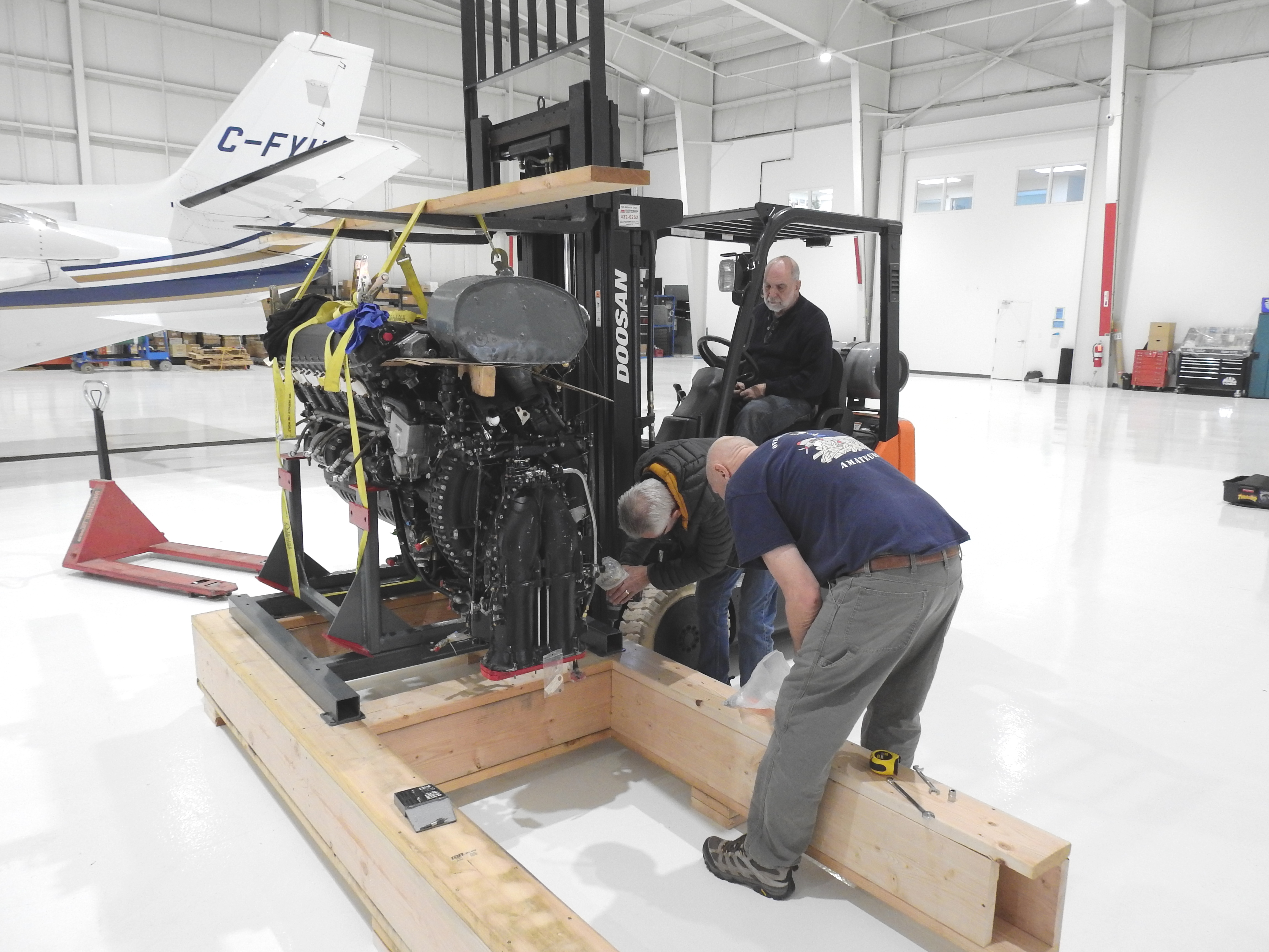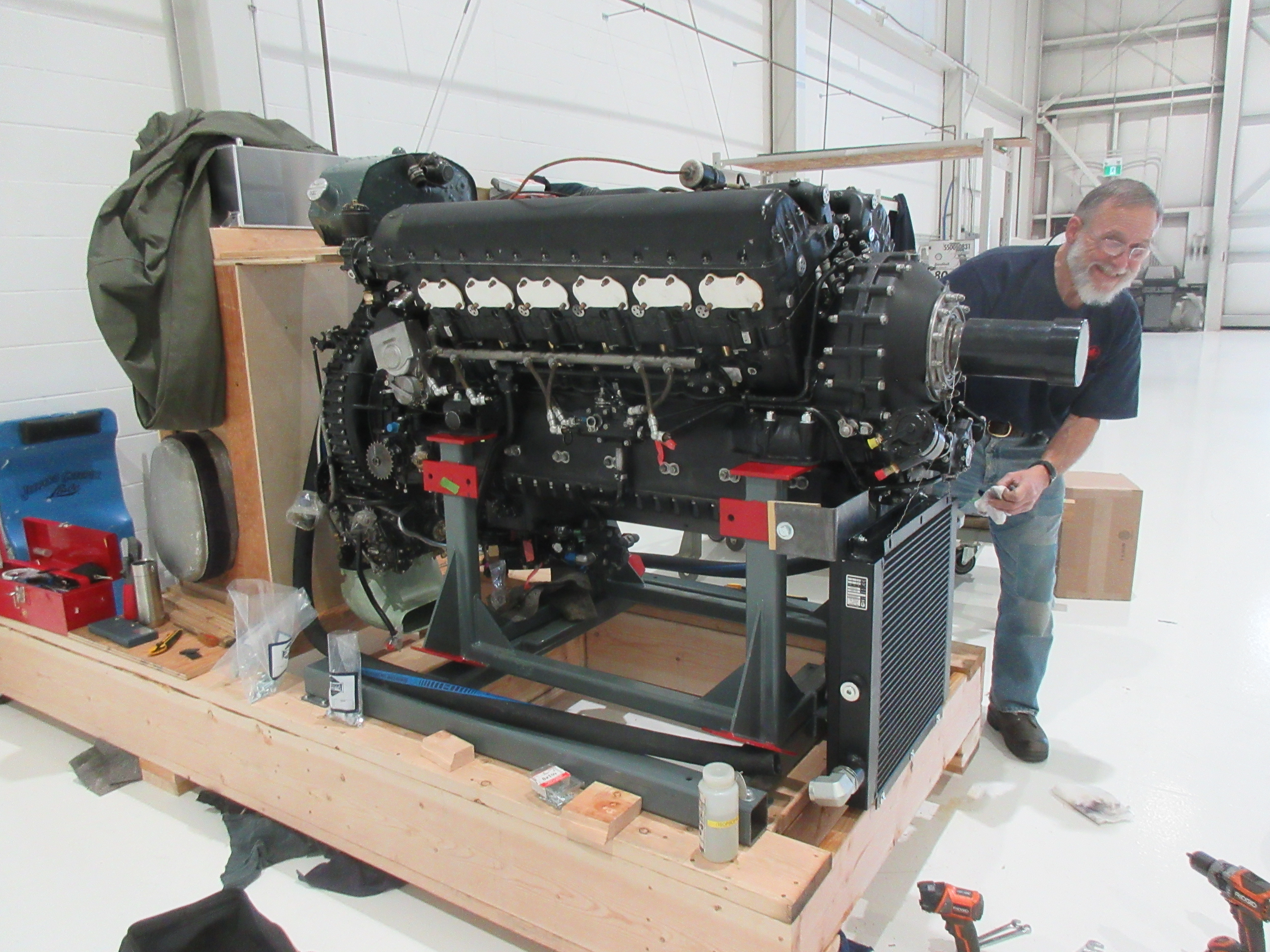 With Jack M. at the wheel, Dick S. and Andy W. position the Hurricane’s Merlin on the wooden base which will serve as our test stand to ground run the engine before dropping it back in the airframe.