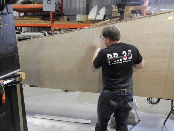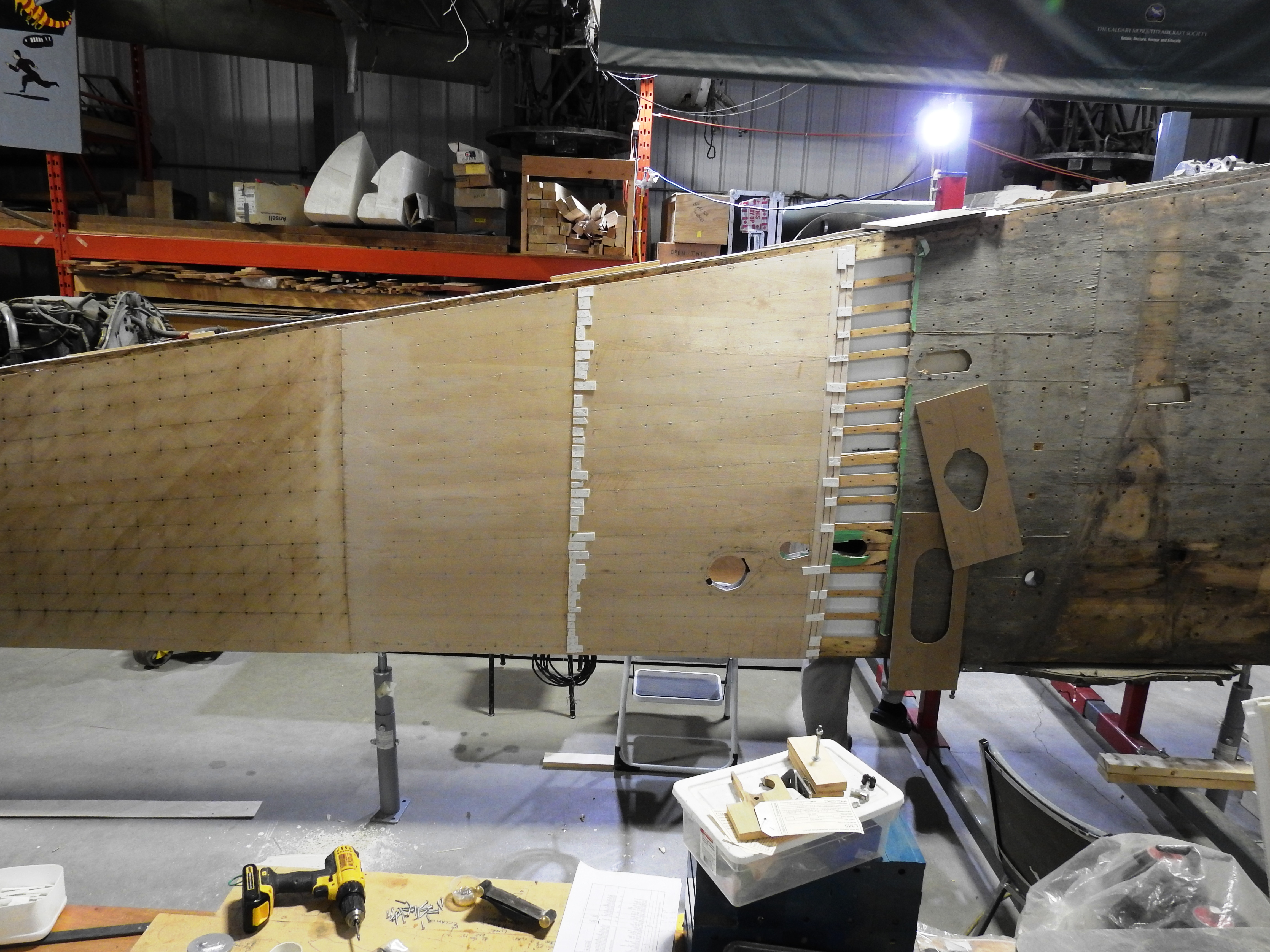 In one photo you can see the many phases of wing skin replacement and some of the challenges we face now and in the near future. Near the lower center of the photo you can see the fuel filler and channel for wing fuel tank pipes. To the lower right side, the original skin is darkened by fuel and coolant stains where they have soaked into the wood.