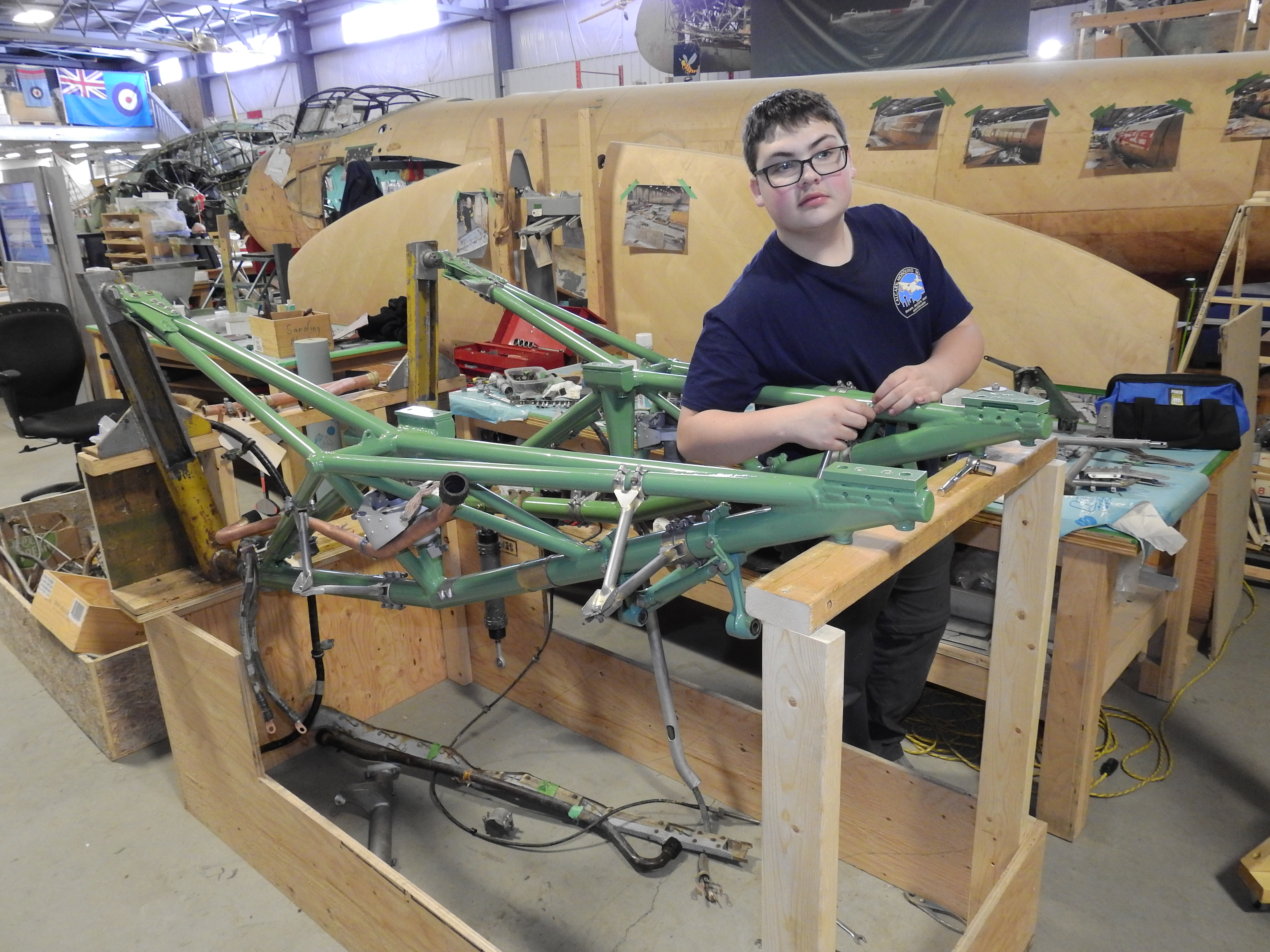 Our Lethbridge father and son team, Joe and Zac M., attending to wing filling and sanding and to the Lancaster engine bearer.