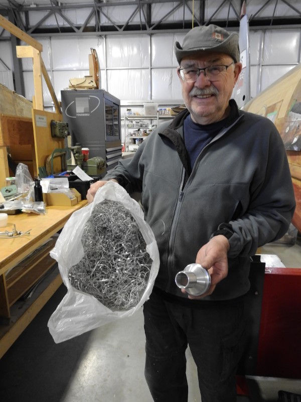 When you start with a much larger chunk of aluminium and need to make an adaptor for an engine to hose fitting, you end up with a whole ‘kitchen catcher’ full of very sharp shavings. Thank you Gary.