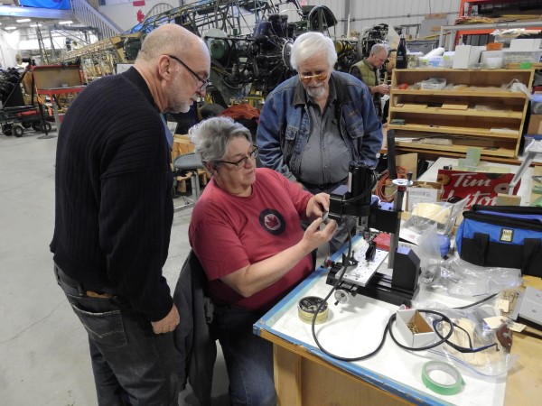 Brian C. under close supervision by Jack M. and Wayne T. as he does some machining on the flap position indicator. Sad to note that Wayne T. has returned to his native Saskatchewan after having been with us from the start of the project in 2012.