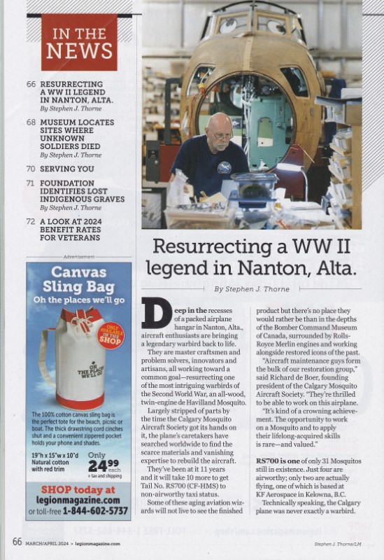 The cover and first page of the story about our restoration work on the Mosquito which appears in the March/April edition of Legion Magazine. Some great national exposure.