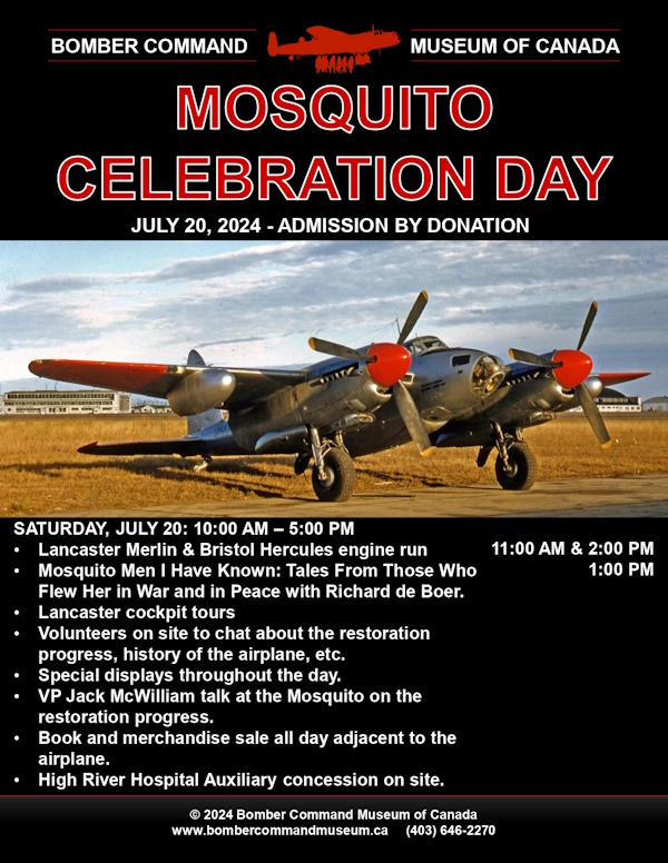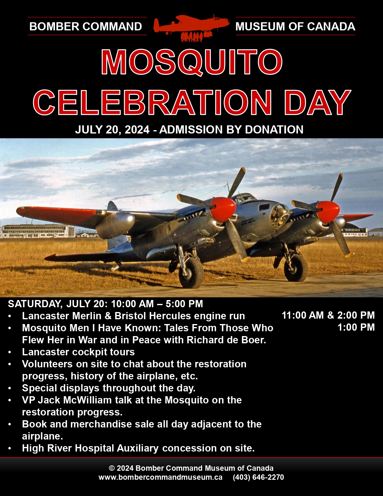 Bomber Command Museum’s poster for July 20th Mosquito Celebration Day. Lots of engine runs, restoration update, merch and presentations.
