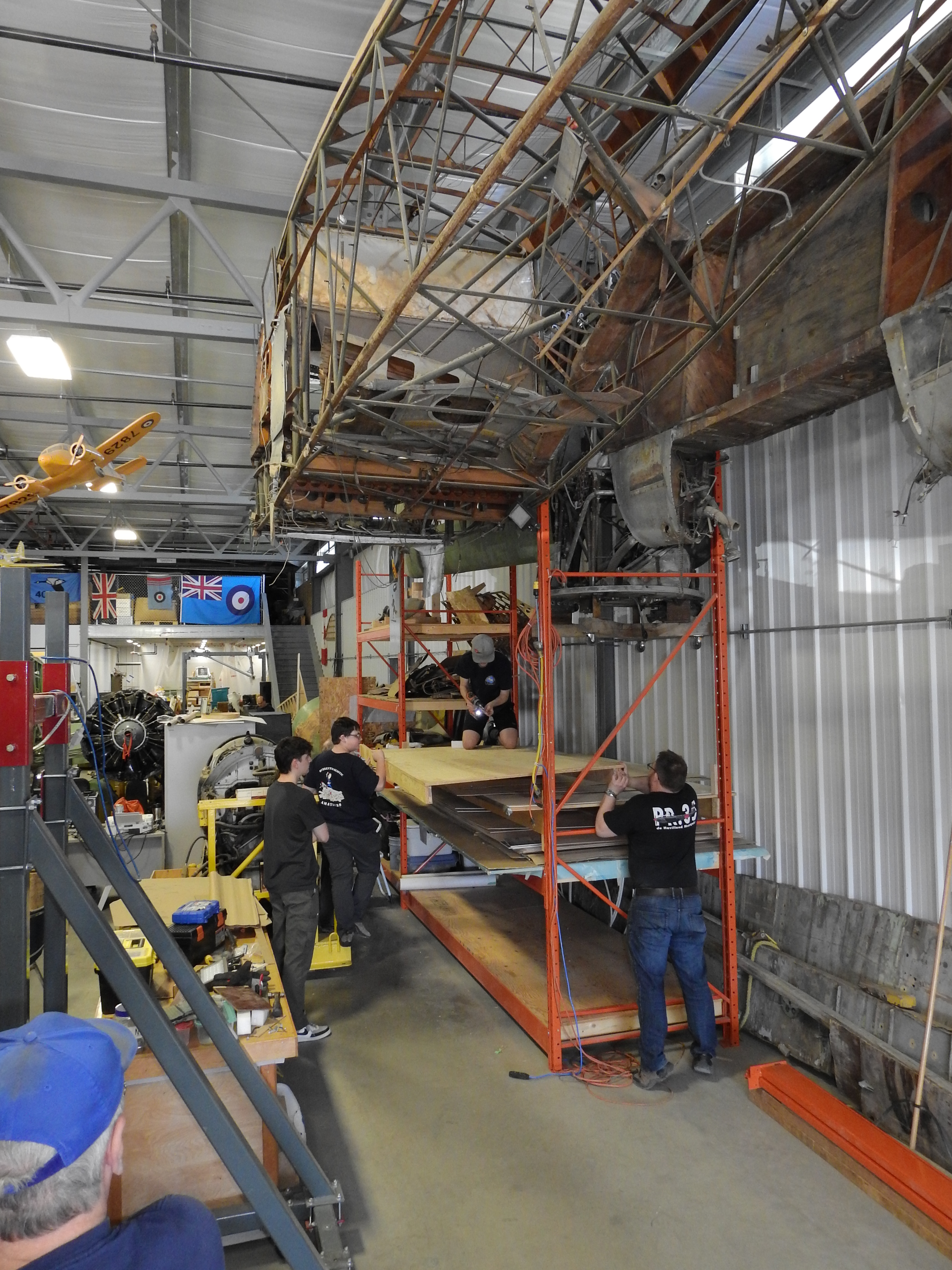 Markus, Zac, Matthew and Joe work on emptying and removing the last shelf unit behind our wing and below the Crane. At right, cleaner than it's been in over a decade; all of the parts boxes, materials and shelving units removed so that the Crane can be lowered directly to the floor. You're welcome Bomber Command.