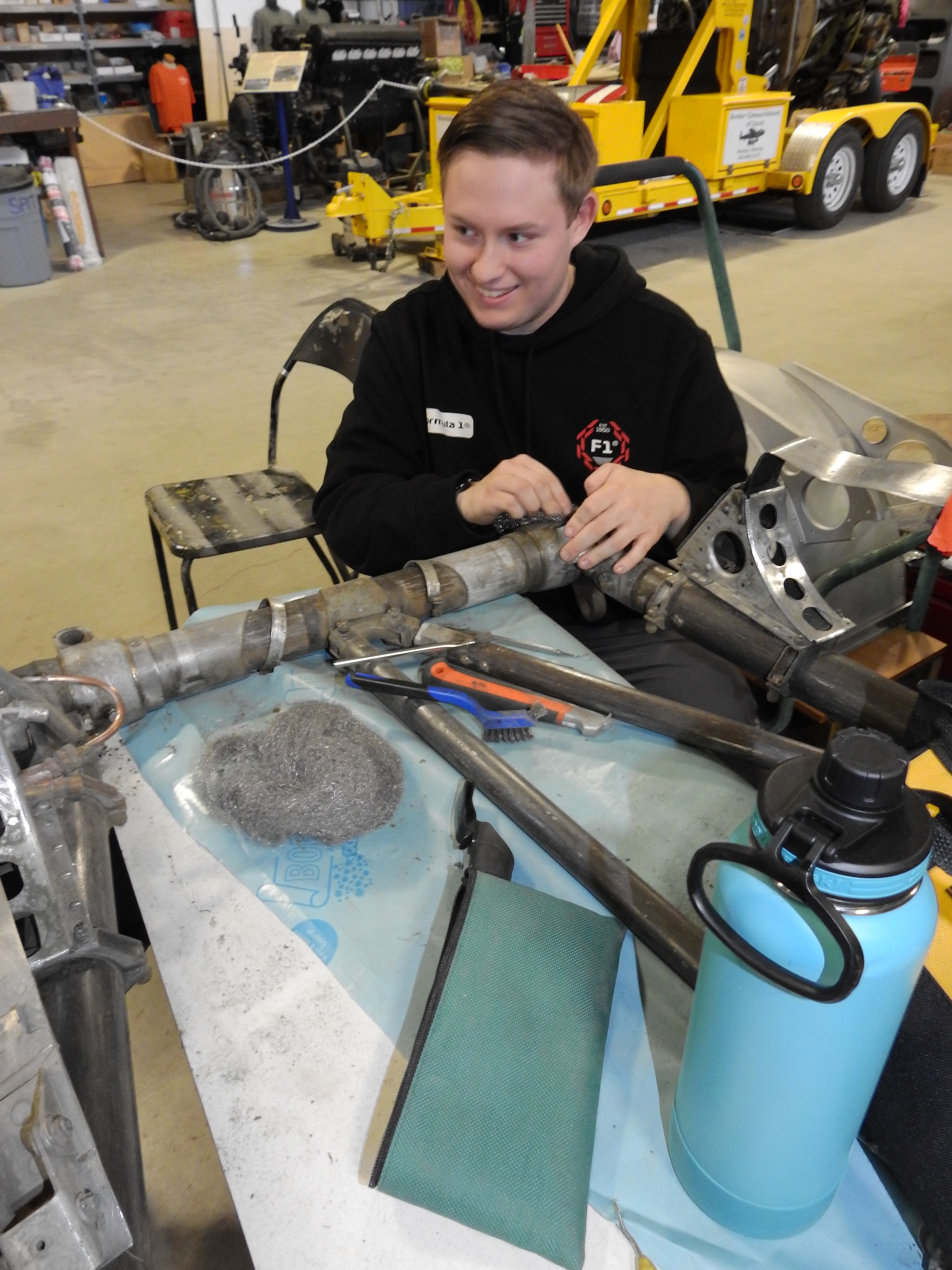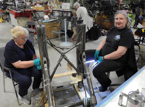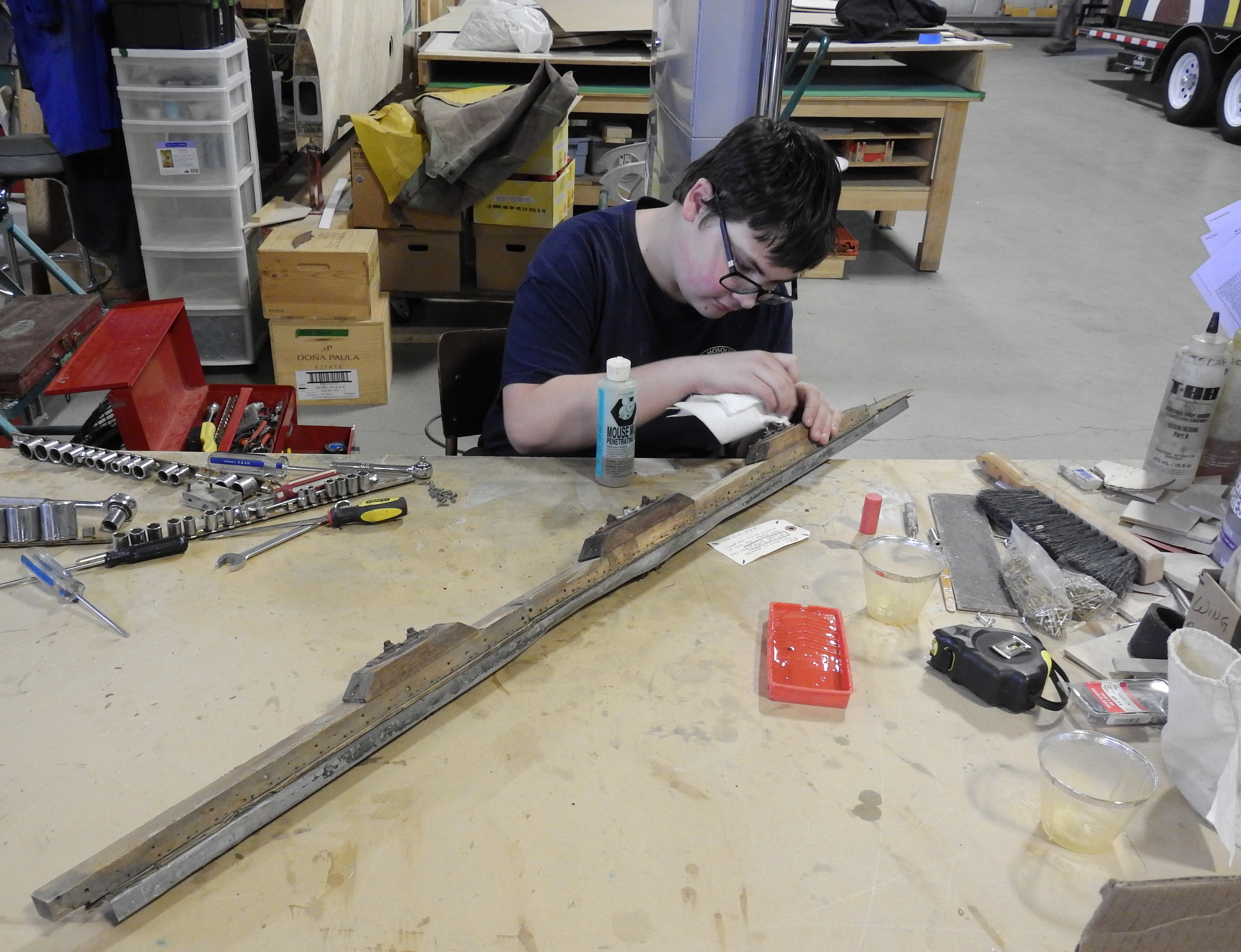Zac M. and Andrew S. have been working on upper wing to firewall components in the area of Gary's work. The component has been dismantled, cleaned by Zac, metal parts straightened by Dick, sent off to the welder for repairs, and then back for paint by Cam. One wood part needs replacement (walnut block) by Gary then it all goes back together. That's how many different people and diverse skills it takes, just to restore one component.