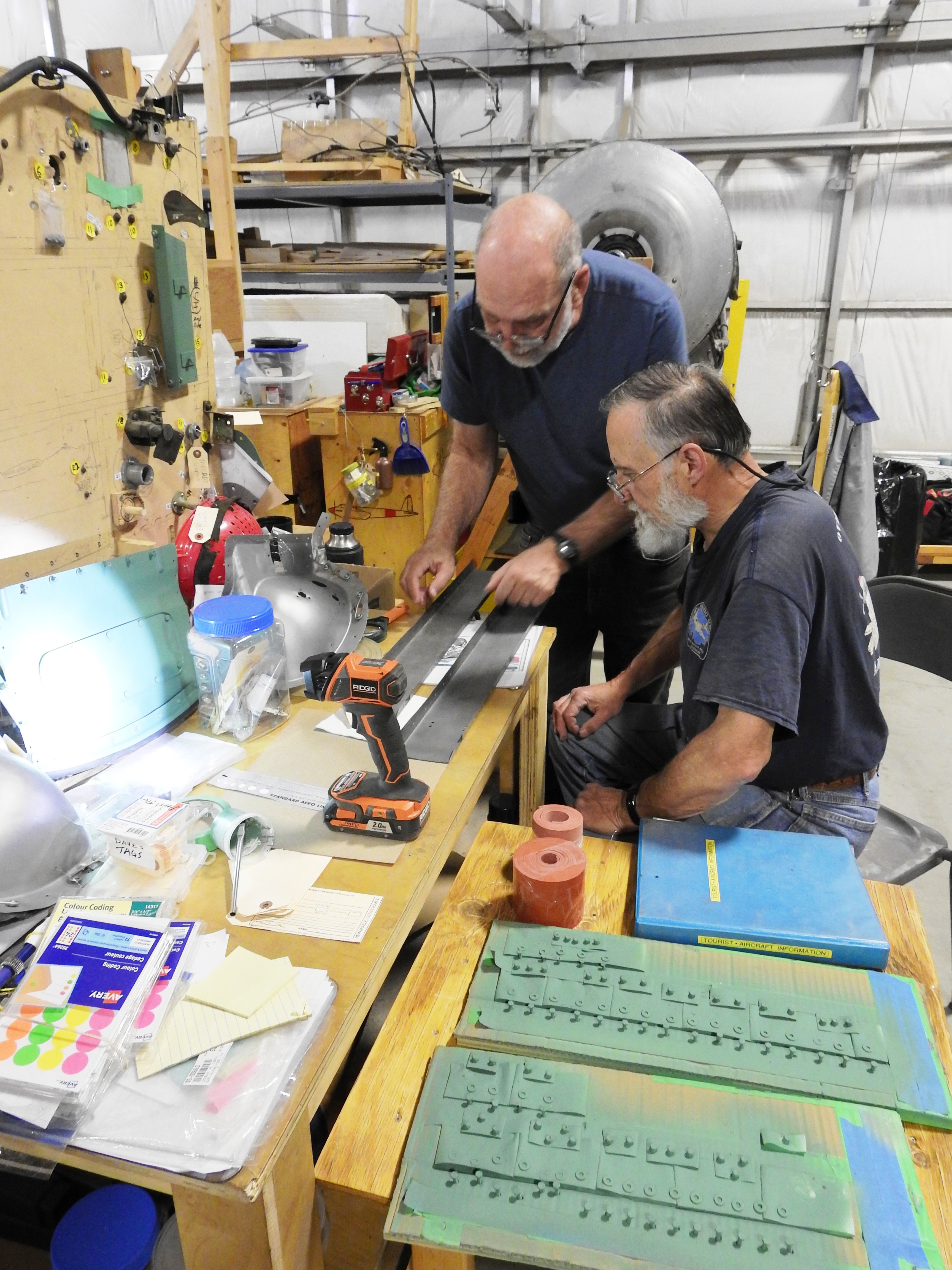 Gerry M. has found his way home from the deep south (Arizona) to pick up on the reinstallation of those wing parts. With new hardware to facilitate the reassembly, Michael H. and Gerry are building up the assemblies. Once these are reinstalled on the port wing, we will remove the mirror assemblies from the starboard wing and do it all again.