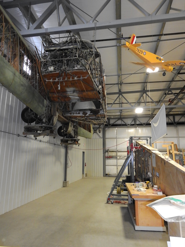 Though our volunteers put in 1659 hours on the Mosquito in this quarter, a significant percentage of those hours were actually spent working with and for our hosts at the Bomber Command Museum. When we moved into the shop area back in August 2012, there was a Cessna Crane project hanging from the ceiling over our work area. When the museum acquired a fully restored Crane, the ceiling dweller was up for grabs and a nice man from Saskatchewan recently bought it. The next issue was how to get it down, in light of the fact that we occupy all the floor space beneath it? For the past six months, there has been a lot of navel and ceiling gazing as we pondered the question while waiting for summer airplane moving season. Because our wing is secured in a jig which is affixed to the floor we can't move it, so it looked like we would have to somehow flip the Crane wing and lift it out, over top of our wing. Ick. The mind quickly goes to all manner of 'oops' possibilities.