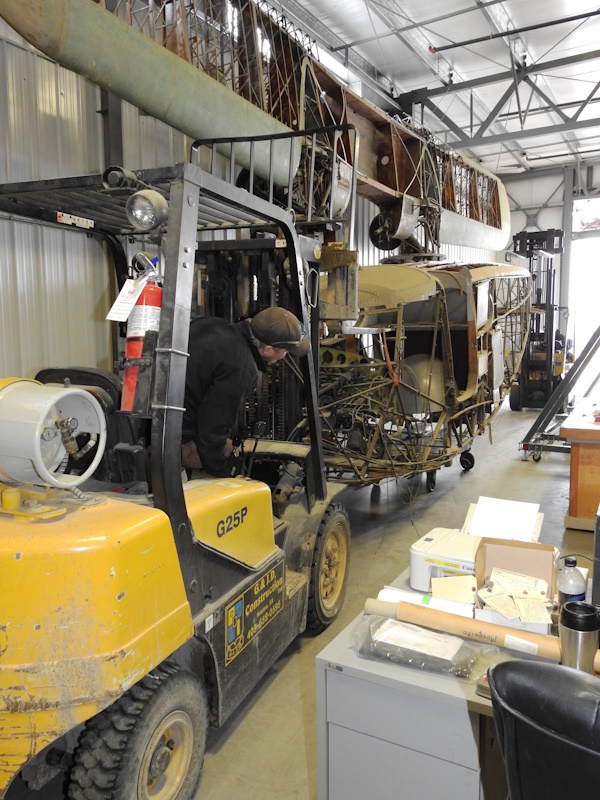 In the end, we settled on moving out all of our parts boxes and materials on the shelves all along the north wall beneath the Crane and then disassembling and moving the shelf units. That was a whole lot of work that occupied many volunteers over several Saturdays. Once completed, the space was clear for the Crane fuselage and wing to be lowered to the floor and scooted out the hangar door to be transported to its new home. That was accomplished in late June and of course once the Crane was down and out of the way, we reversed all of our efforts to rebuild the shelf units and put all of our boxes, parts and materials back where they were. In the process we were able to dispose of some 'no longer neededs' and reorganize some of our hard to find and keep track of parts. Big thanks to all of our Saturday volunteer crew who did the haulin' and sweatin'.