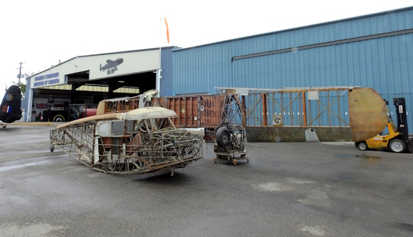 At top, dropping the Crane fuselage to the floor. Excellent work by the crew on the job. Below, the Crane outside, awaiting transport to its new home in Kindersley, SK. For us, it meant having to put all the shelves, boxes, materials and parts back.