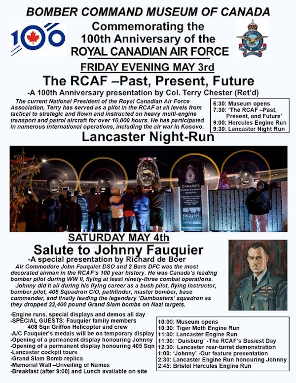 On the May 3/4 weekend, the museum held its biggest event of the season to celebrate the 100th Anniversary of the Royal Canadian Air Force. Things kicked off Friday night with an overview of the RCAF's history by Col. Terry Chester, National President of the Royal Canadian Air Force Association, which was followed up by the departure of a 408 Squadron helicopter and a Lancaster night run.