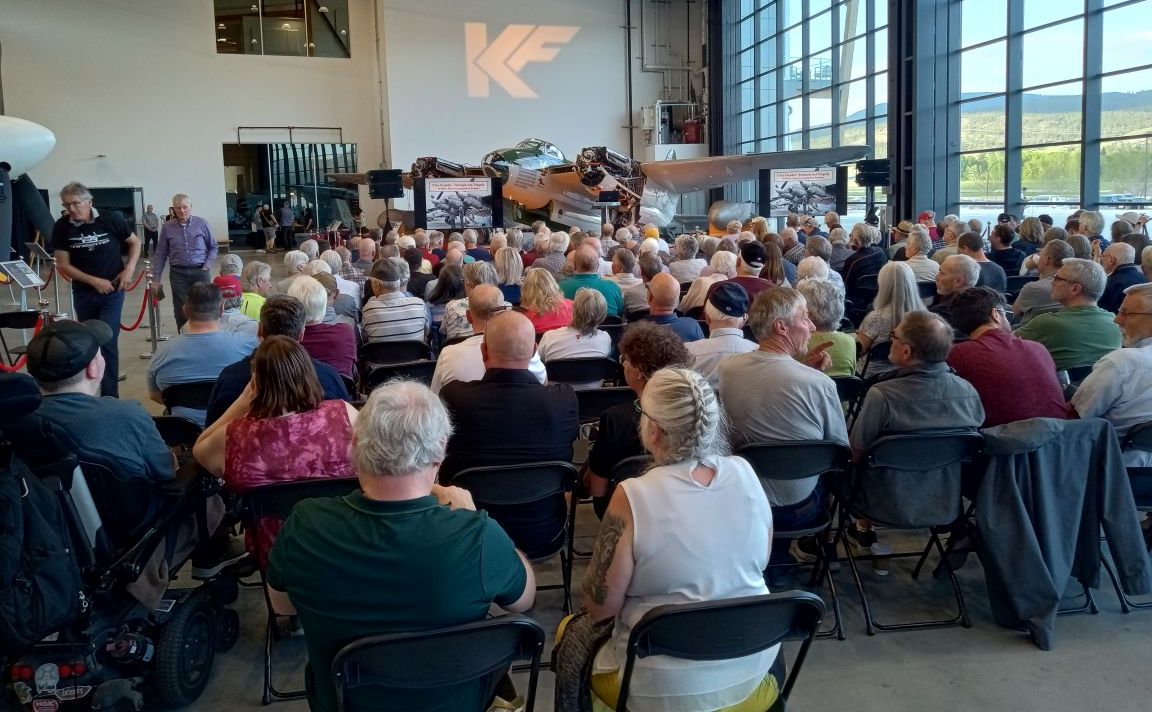 The audience at KF Aero's Centre for Excellence at their VE Day Anniversary event. Former Spartan Air Services Mosquito CF-HML made a great backdrop for the event.