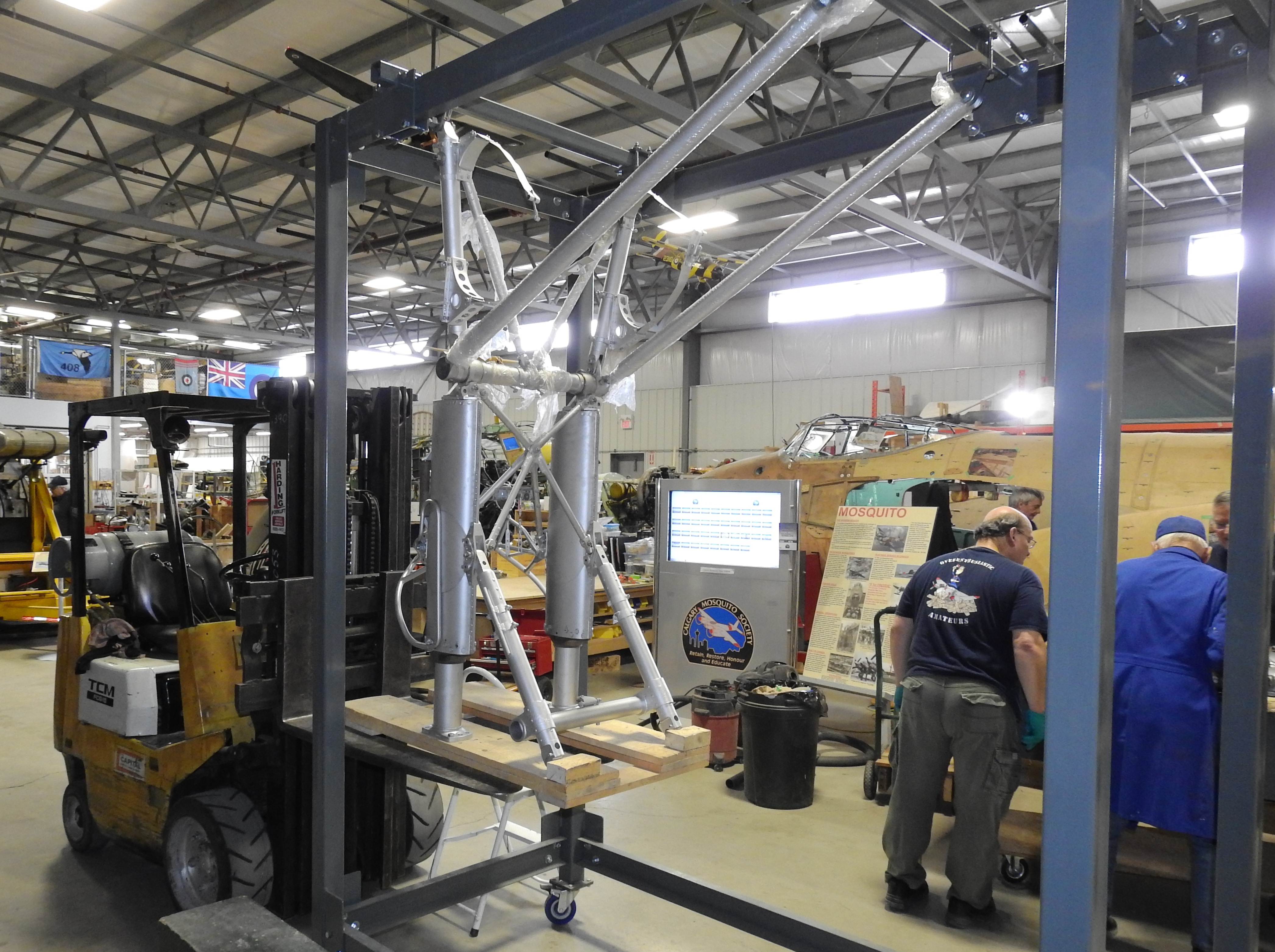 The restored main undercarriage assembly gets fork lifted into the jig we built in order to add the hydraulics and main wheel. A milestone moment.