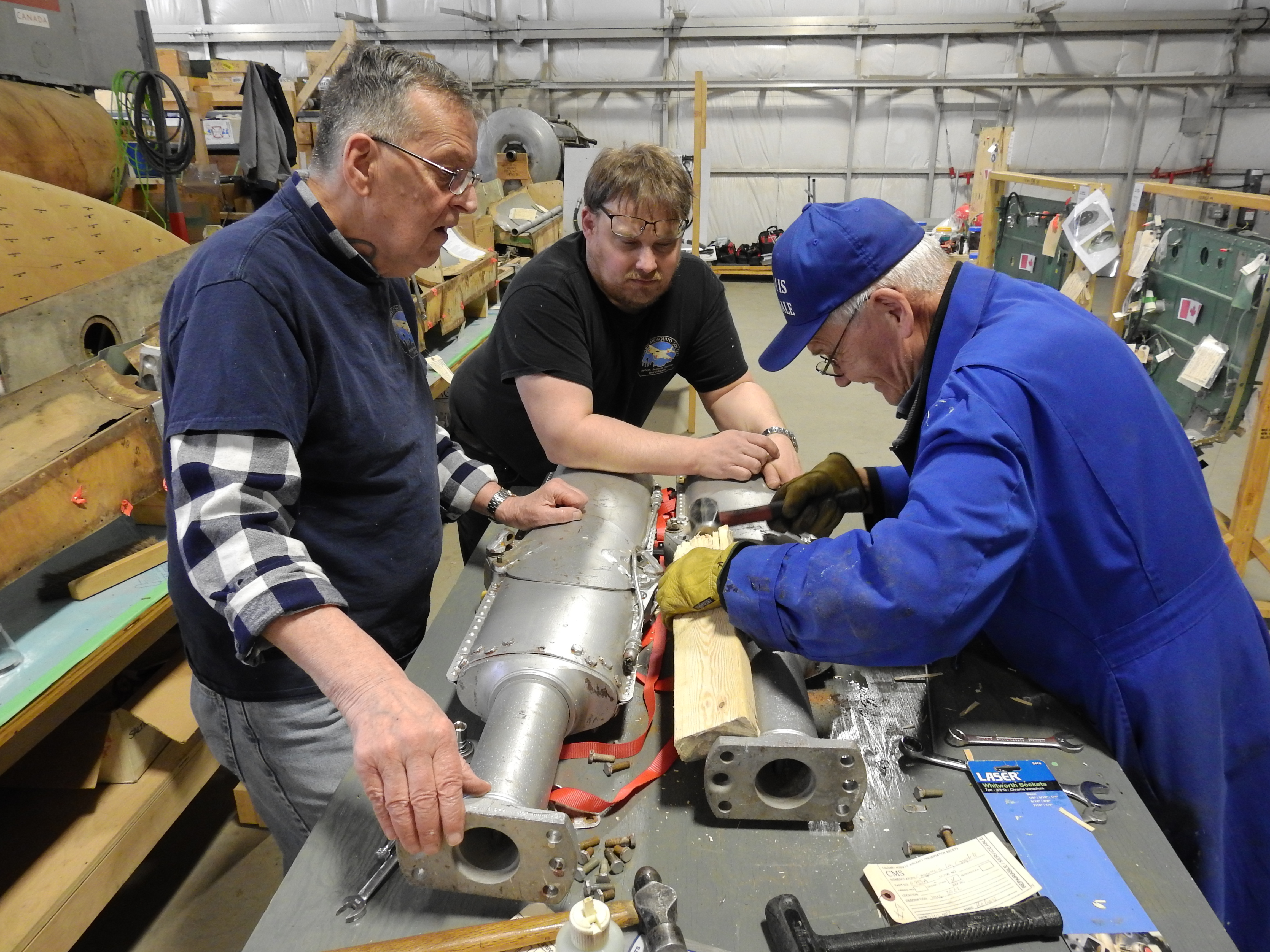 Alan W., Joe M. and Dick S. take turns whacking the lower end of a spare undercarriage leg in order to get to the piston cap.