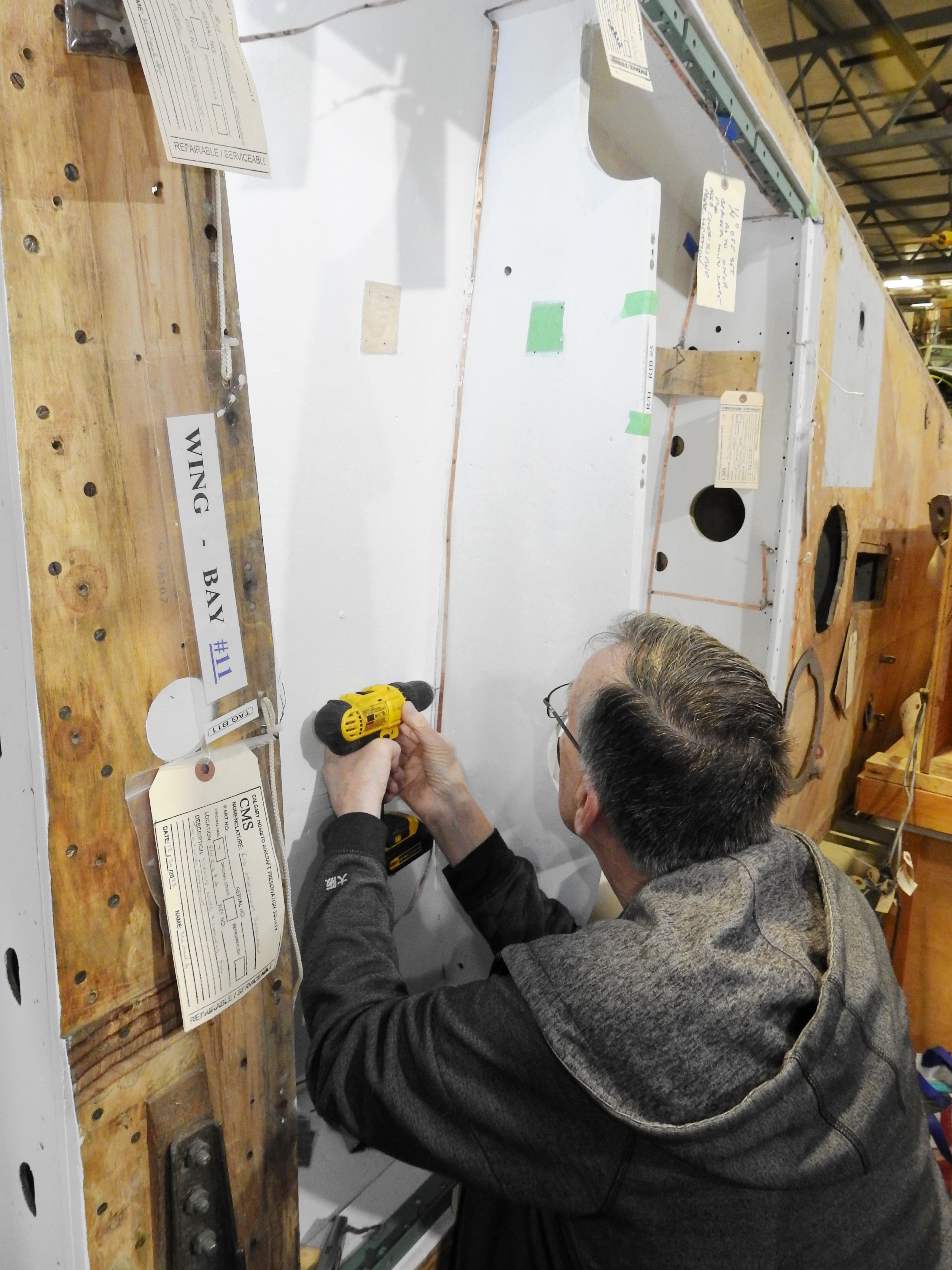 As well as the larger projects, there are lots of individual triumphs such as Colette P. getting trailing edge parts cleaned, or Zack M. polishing the static ports and discovering original markings under all the old grunge. Alan W. has done well to reinstall long runs of copper grounding straps in the outboard fuel tank bay. This involves finding the original nail holes under the new paint, and cleaning them out before tacking down the copper with original quarter inch brads.
