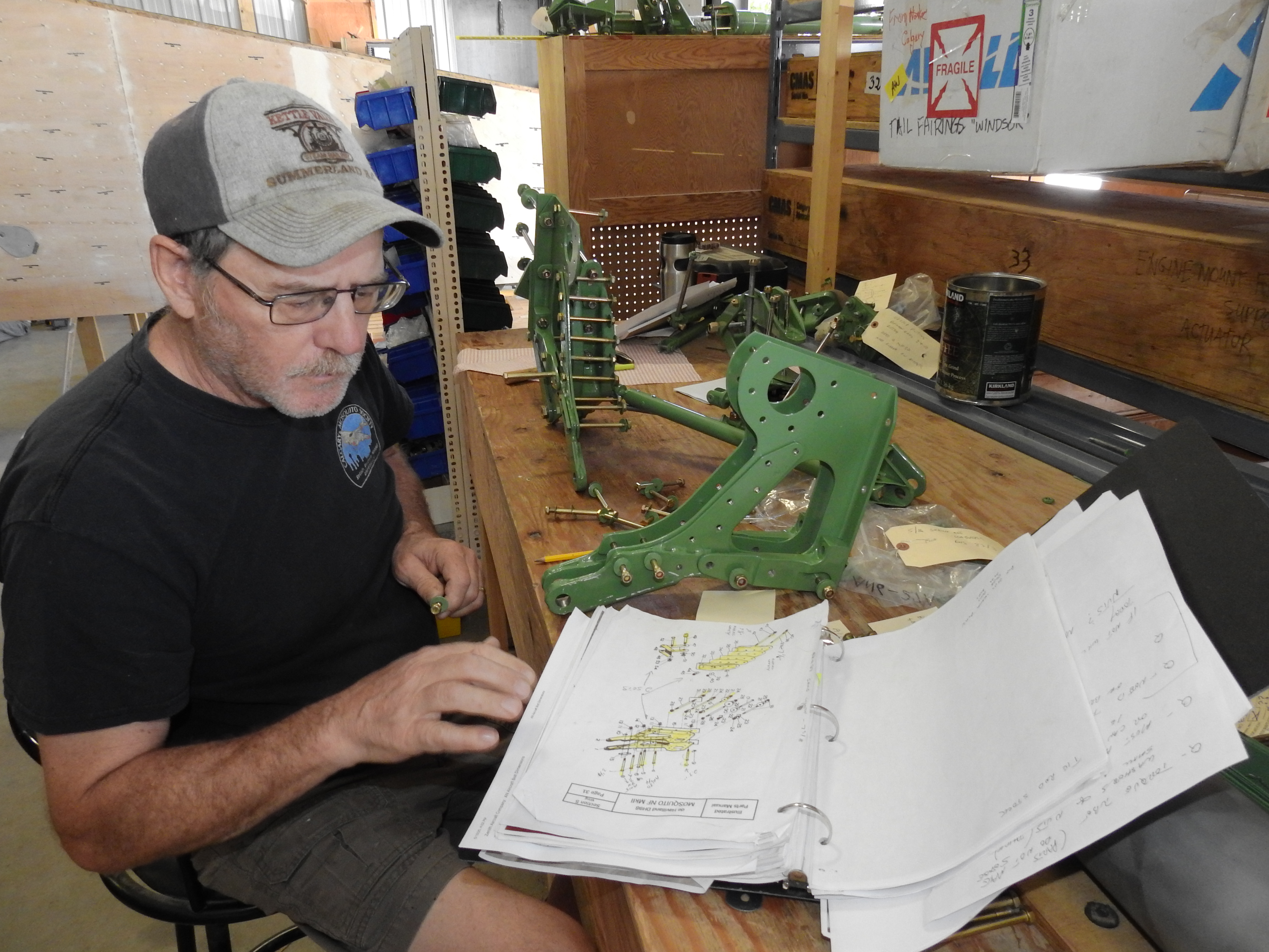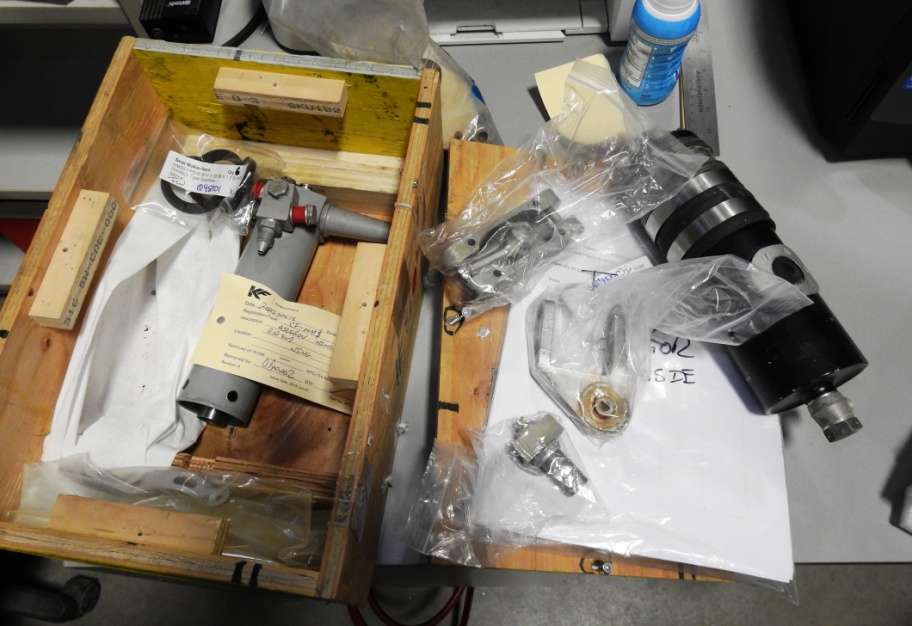 Goodies from D’Arcy Barker at KC Aero Centre for Excellence. Borrowed air dryer at right, with our tail wheel retract jack in the box with some of our aileron hinge and pushrod bits.
